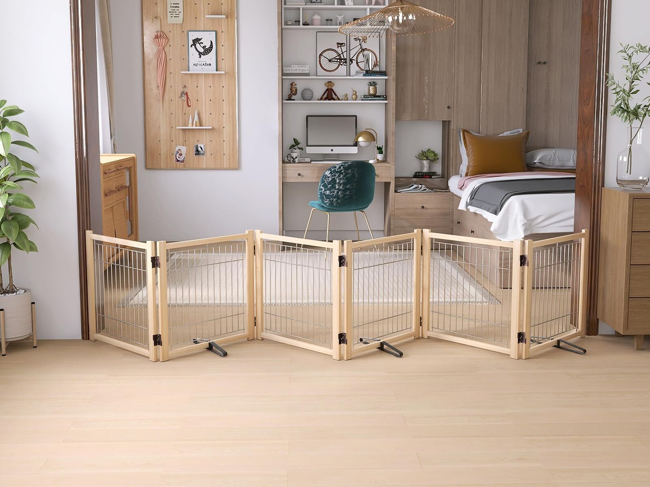 犬 ゲート ペットゲート ペットフェンス 犬用ゲート 天然木色 犬用フェンス 犬 柵 ペット用家具フェンス 安全柵 小型犬 中型犬 脱走防止 ガード 飛び出し防止 多頭飼い ペットガード(高さ58cm、長さ350cm、6つのパネル)