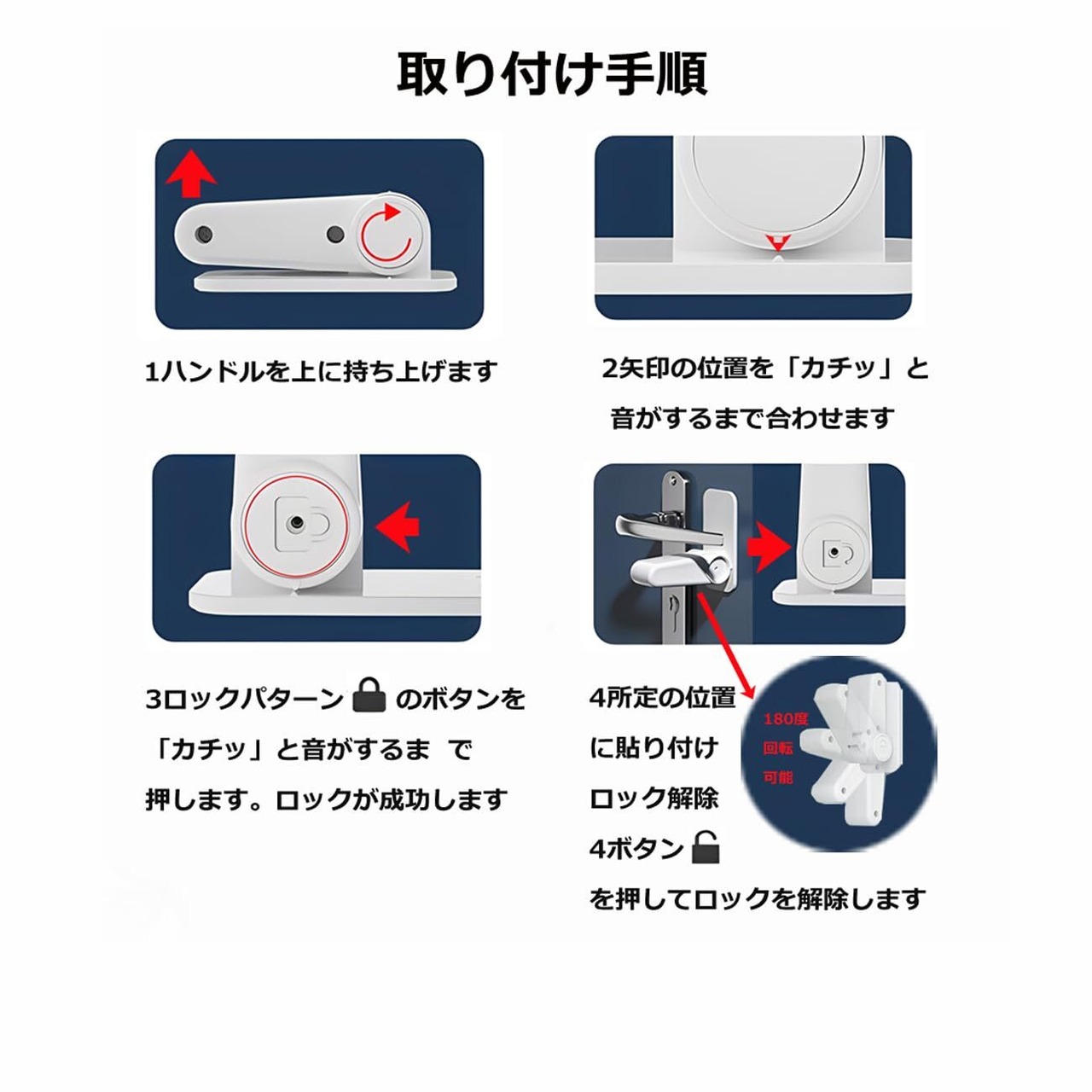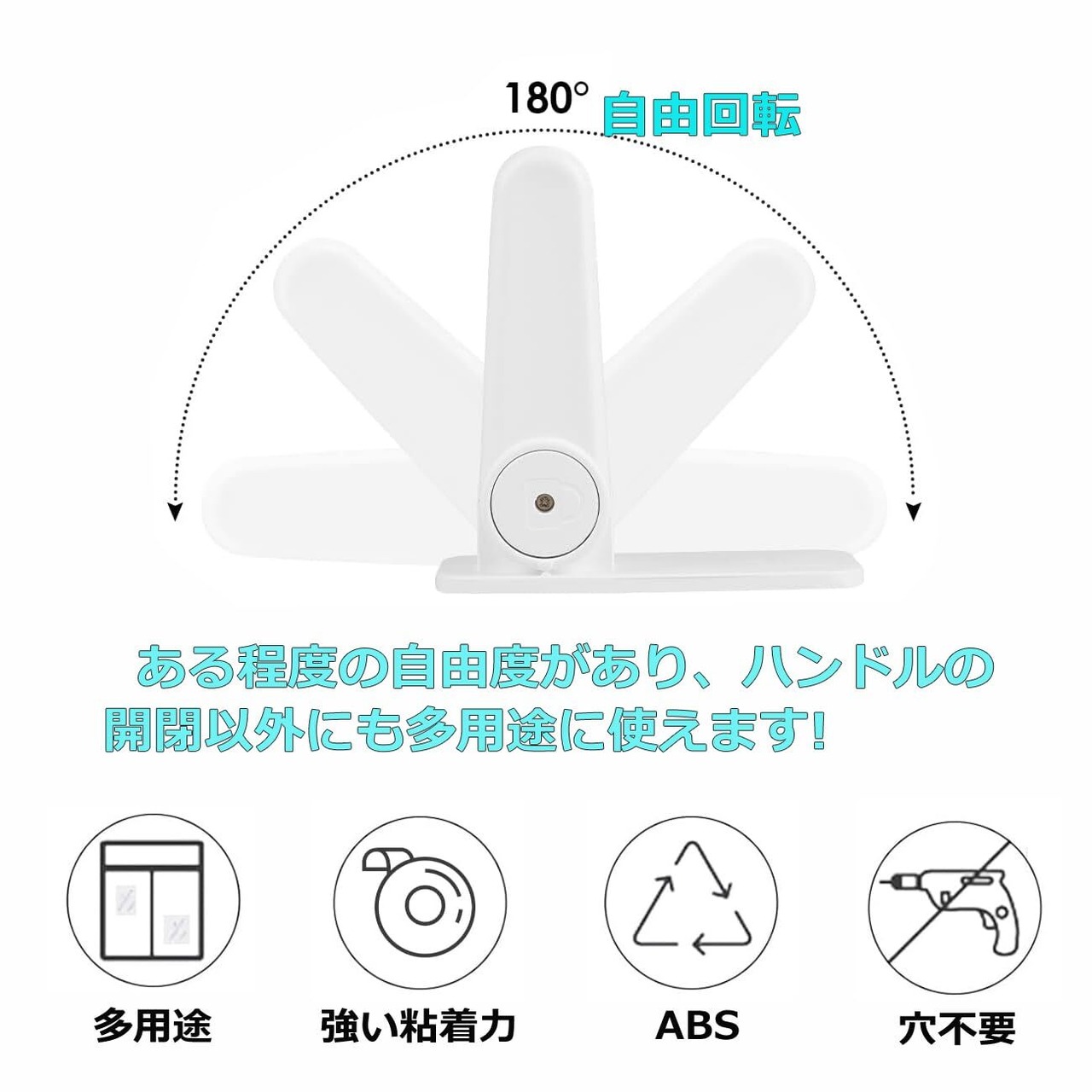 【180°回転可能、多用途】180度角度でもロックできるのでドアノブ以外も色々な使い方が出来ます。例えば戸棚扉開け防止、引き出し開け防止、冷蔵庫ドア開け防止、窓開け防止などのところが使えます。犬も猫も子供もこのドアノブロックを使えます。ドアノブ ロック後付けのドアロックとして使えます。ドアノブごと交換するより安く済み経済的です。