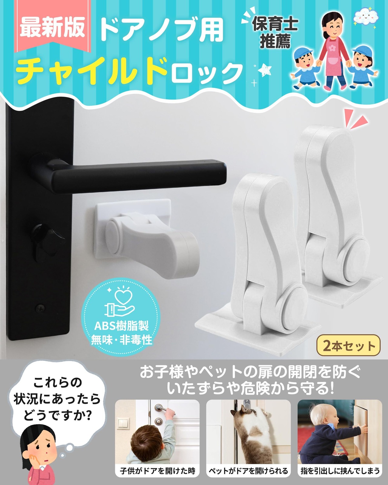 【ドアノブ専用チャイルドロック】お子様やペットの扉の開閉を防ぎ、いたずらや予期せぬ危険から守ります。中央のロック部分には内蔵溶接技術を使用しており、非常に強固で耐久性に優れています。180度開閉できるのでドアノブ以外にも設置可能。キッチンや冷蔵庫など開けたら困る場所にも楽々取り付けます。