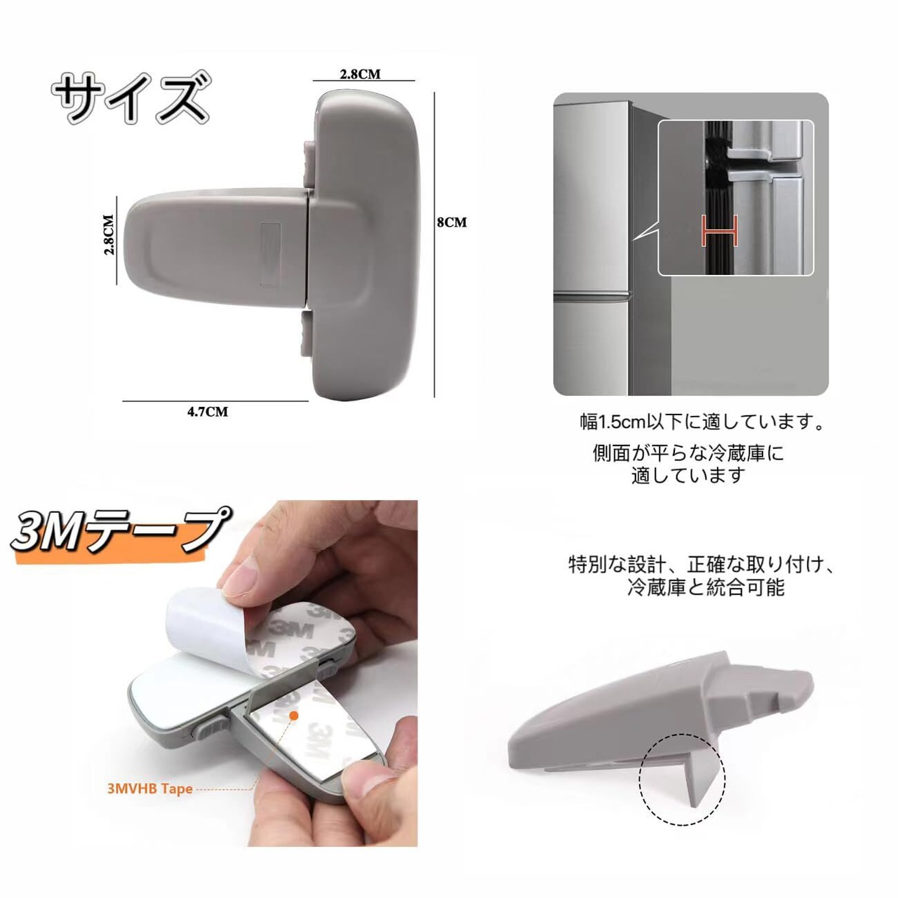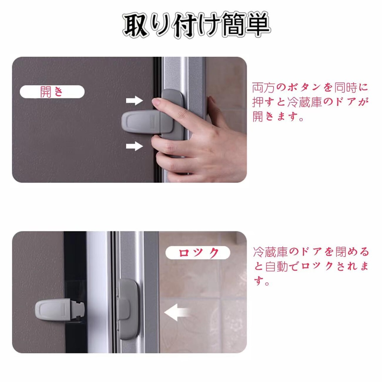 【取り付け簡単だし簡単には外せない】この商品は、取り付けも、動作も簡単で使い易い。開ける時は2つのボタンを押しながら、閉じるときは何もすることなく自動でくっつきます。(フラットオープン冷蔵庫に適用)取り付けるときは、粘着力が強い3M接着剤を剥がすだけで取り付けることができ、取り付け簡単です。 冷蔵庫を開けるときは、片手でボタンを同時に長押しすると冷蔵庫のドアが開き、閉じるときは何もすることなく自動でくっつきます。