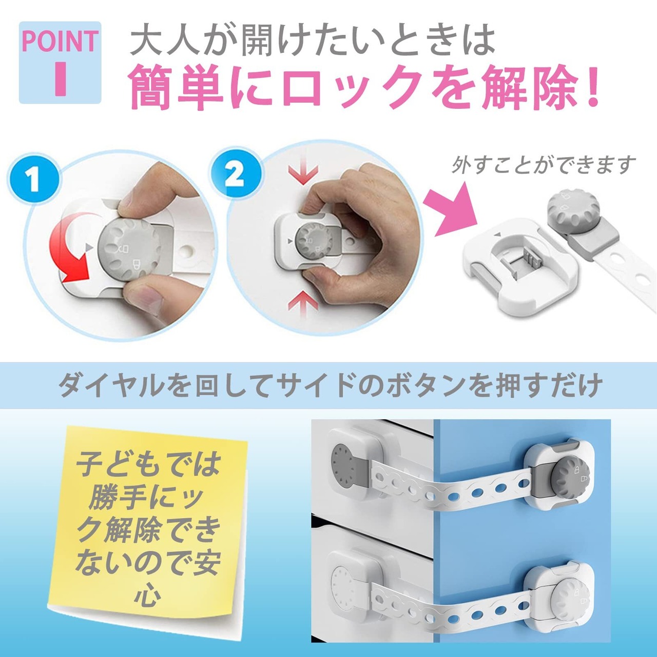 ◎2段階でロック解除できる赤ちゃん用ドアロック◎ ダイヤル付きのバンド式ドアロックです。 ダイヤルを回して両端のボタンを押すとロック解除される仕組みなので、 子供には開けられず安心です 左右のボタンを同時に押して開けるよりも難易度が高います。 リビング、キッチン、寝室などの引き出し、両開きの扉やトイレなど様々な場所に適用できます。