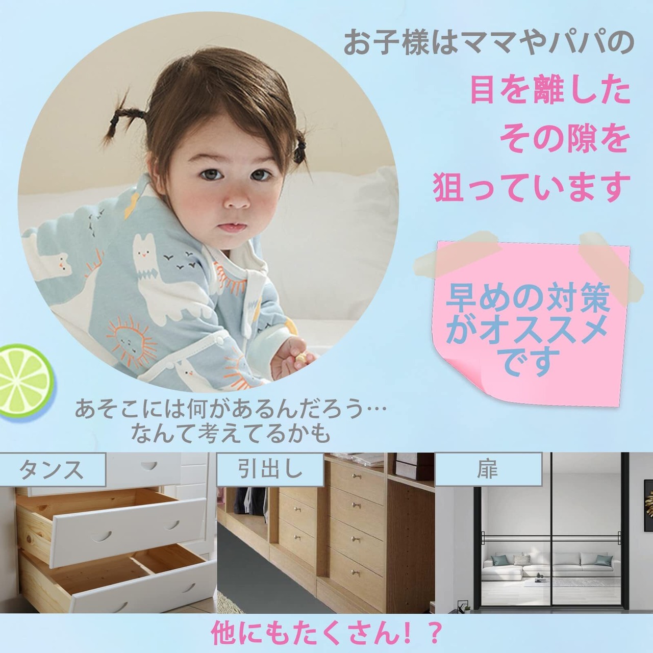 お家の中は危険がいっぱい◎ 自分で移動できるようになった赤ちゃんは、とても好奇心旺盛です。ハイハイし始める生後9ヶ月ごろから、興味のあるものに近付いて触ったり口に入れようとしたりするので、パパママも油断できません。しっかり見ているつもりでも、ふと目を離した隙にドアや戸棚の扉を開けてしまい、赤ちゃんが怪我をしてしまうことも。 ドアロックは赤ちゃんが扉やタンスの引き出しなどを開けられないようにロックするため、思わぬ事故防止に役立ちます。