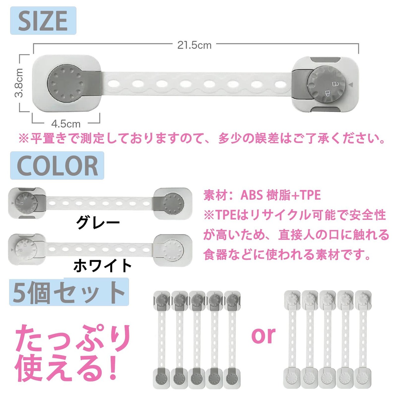 ◎製品仕様◎ サイズ:全長約21.7cm×横約3.8cm、貼り付け部分約4.5cm×約3.8cm ベルト調整サイズ:約2cm~約10.5cm 素材:ABS+TPR セット内容:チャイルドロック5本セット ●注意事項 ※予告なく写真より多少デザインが変わったり、色が異なったりする場合がございます。 ※取外し時にできた傷等については責任を負いかねます。