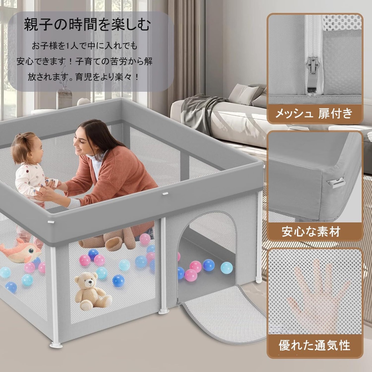 安全なジップドア設計:ゲートのジップロックにより、赤ちゃん自身が外に出ていくのを防ぐことができます。特殊なジップは親しか外から開けられず、赤ちゃんが一人で開くことはできません。親は安心して使用できます。