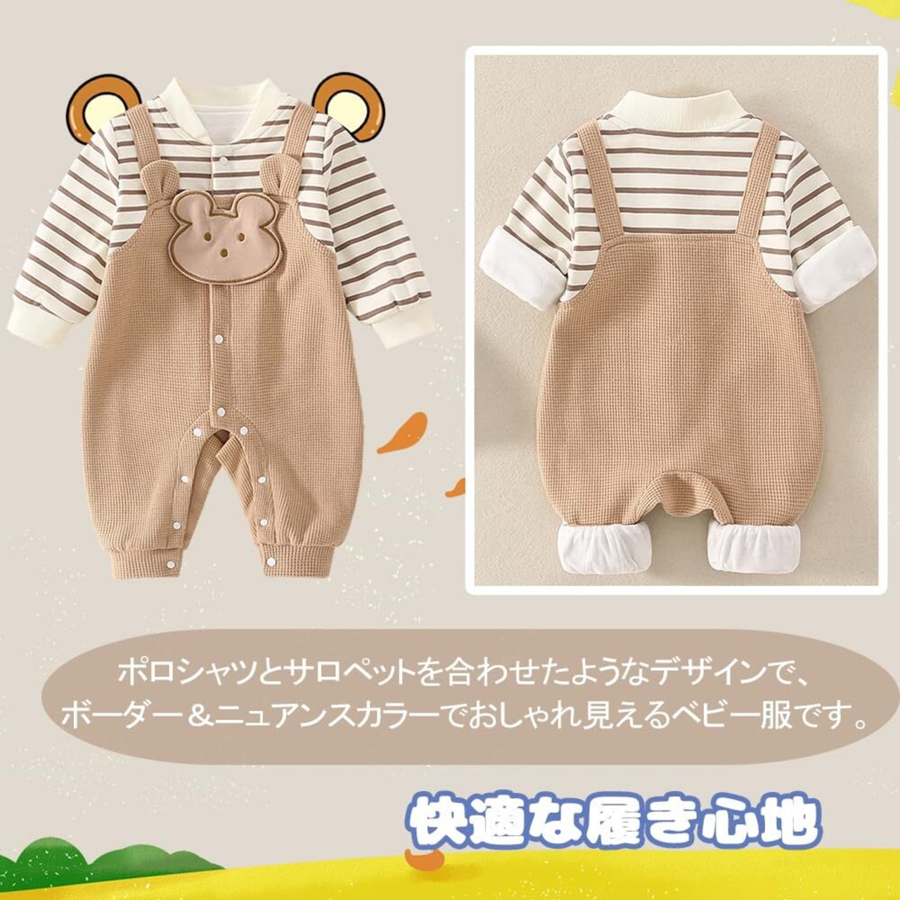 デザイン‐ポロシャツとサロペットを合わせたようなデザインで、ボーダー&ニュアンスカラーでおしゃれ見えるベビー服です。この1枚でコーディネートが完成し、通園通学などシーンにぴったりです。胸元にクマの刺繡がポイントです。