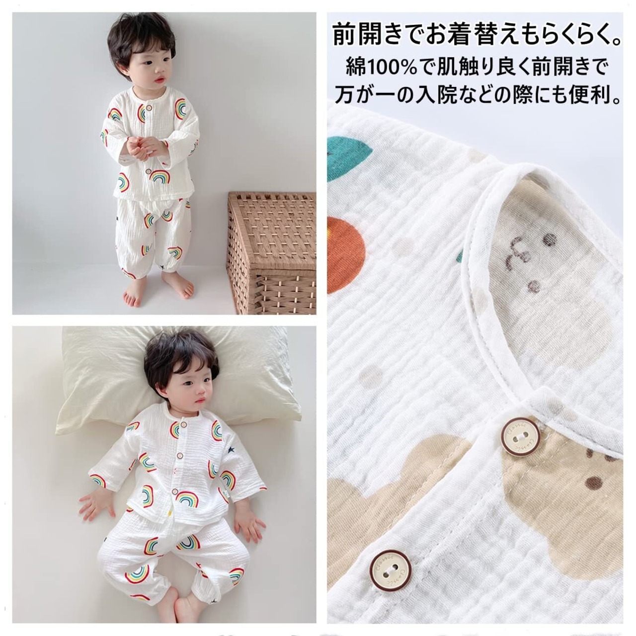 【商品仕様】素材:肌にやさしい綿100%、生地:ダブルガーゼ、通気性:良い、伸縮性:あり、質感:とても柔らかい、前開きタイプ:着替えやすい、厚さ:薄手/春・夏・初秋、トップス仕様:長袖/丸衿、パンツ仕様:長パンツ/ウエスト総ゴム、かわいい総柄プリント:虹/くま柄。