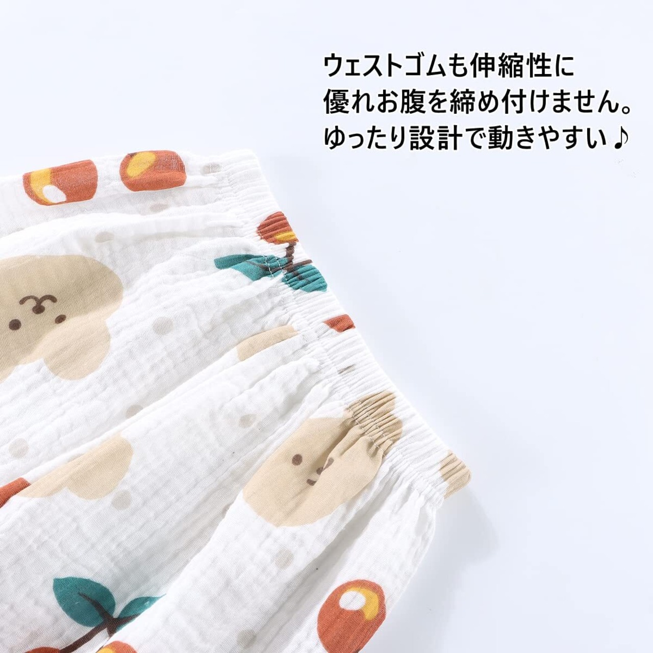 【ウエスト総ゴム】ウエストゴムでお子さまもひとりで簡単お着替え伸びるので締め付け感がなく動きやすいです。部屋着やルームウェアとしてはもちろん、保育園着にもおすすめです。