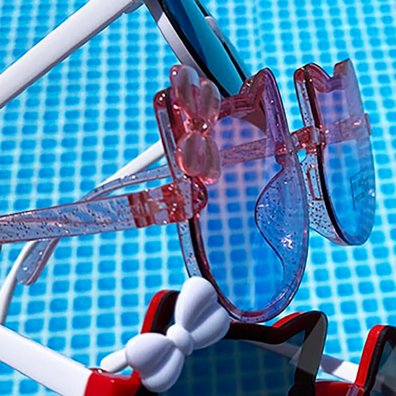 カラフルでお洒落なサングラスですが、レンズはUV400で大切な目を紫外線から守ってくれます。お子様ならではのカラフルなサングラスです!!毎回完売の大人気なねこ耳に、今回はリボン付のフレームをご用意しました。 クリアピンクは、フレームとテンプル部分はラメ入りで、リボンは同色ですがラメ無しです。また、レンズも薄い色がついている感じの半透明ですが、UVプロテクト効果は他色同様にUV400です。また、レンズの下半分が薄いブルーのグラデ―ションレンズになっております。お洒落で軽くて機能的。ソフトケース付きなので、紛失や破損も安心です。クリアピンクはピンクのケースでのお届けになります。