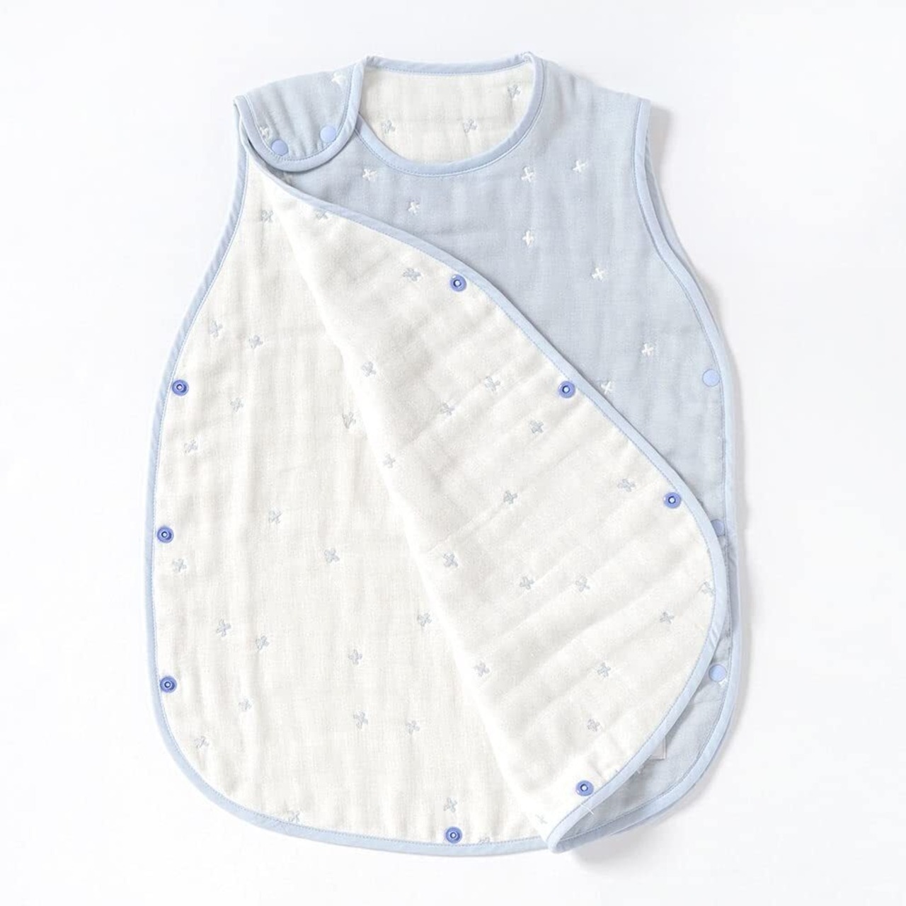 寝冷え防止に活躍する6重ガーゼキッズサイズスリーパー。 寝る時に着せておけば、おふとんからはみ出しても安心です。 股下の部分にはボタンがついているので、はだけてしまうのを防ぎます。 右肩・両脇はスナップボタンで全開するので、着せる時もおむつ替えも楽々です。 中層にコットン糸を、肌に触れる表・裏層にはオーガニックコットン糸を使用することによって柔らかな触り心地に仕上げました。 【ふくふくガーゼ】 吸水性と保温性を兼ね備え、1年中ずっと使えます。 表面は細い糸、真ん中に進むにつれて太い糸を使用して織ることで、ボリューム感を出し、洗えば洗うほどふっくら感が増すのが生地の特徴。 昔から織物が盛んな愛知県三河地方の高い技術力とこだわりを結集して作りました。 2018年に「おもてなしセレクション」を受賞した「ふくふくガーゼ」は、ご自宅用にもギフトにもおすすめです。 散りばめられたクロス柄は、天使のようであり、鳥や星の瞬きのよう。 “いつもあなたのそばに" 赤ちゃんの笑顔に引き寄せられ、赤ちゃんの周りには、自然と幸せがあふれています。 そんな、赤ちゃんの誕生を祝福するテキスタイルです。 やさしい色合いのシェルピンクと、甘すぎず、インテリアにも馴染みやすいパウダーブルーの2色展開です。