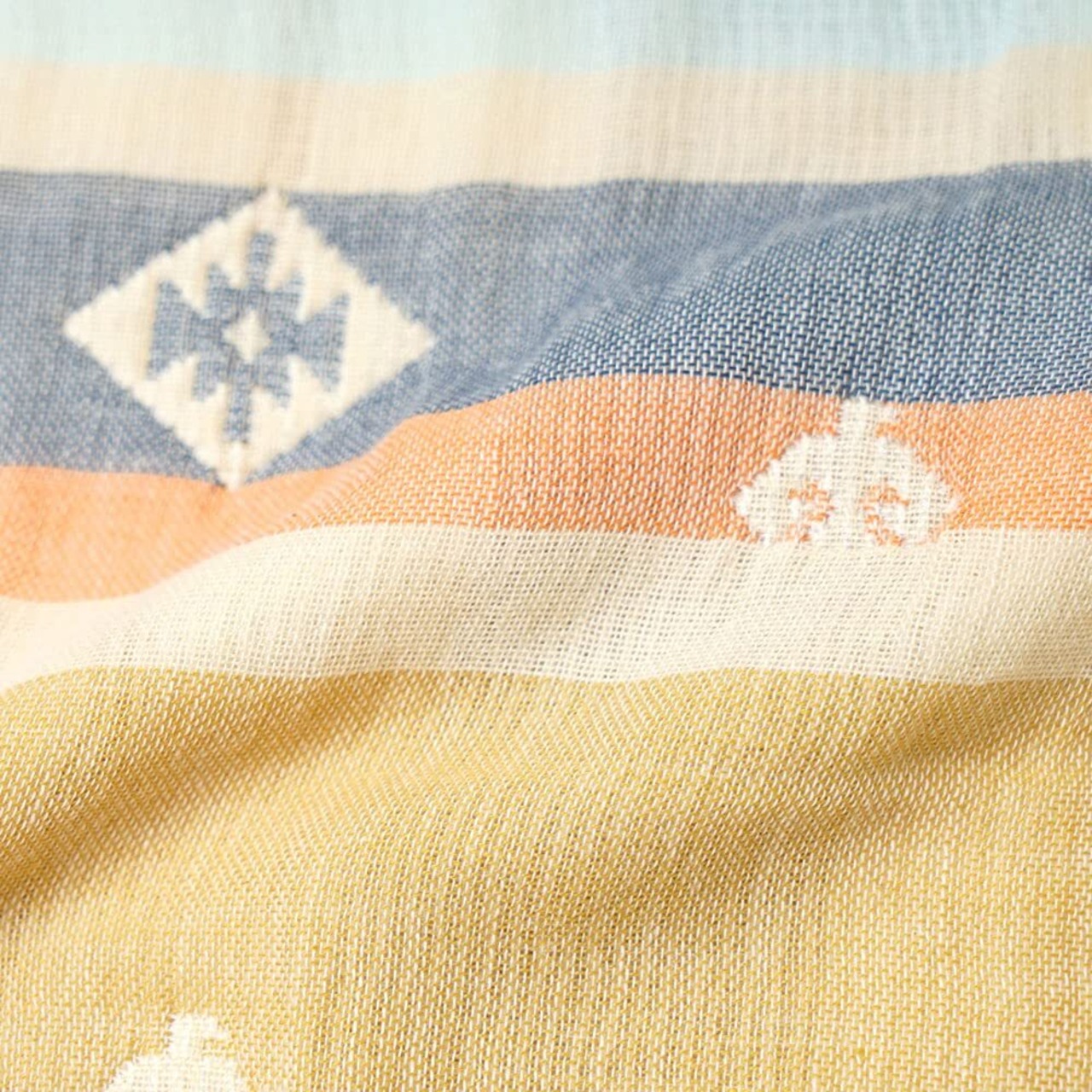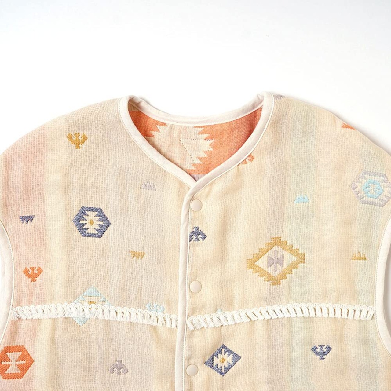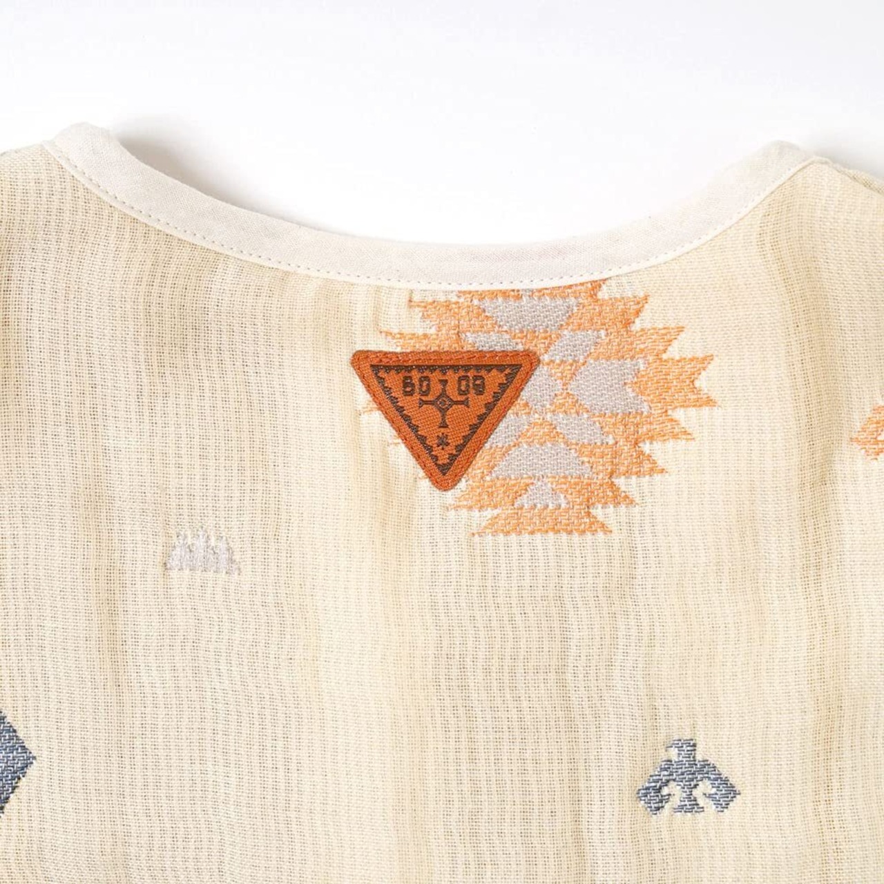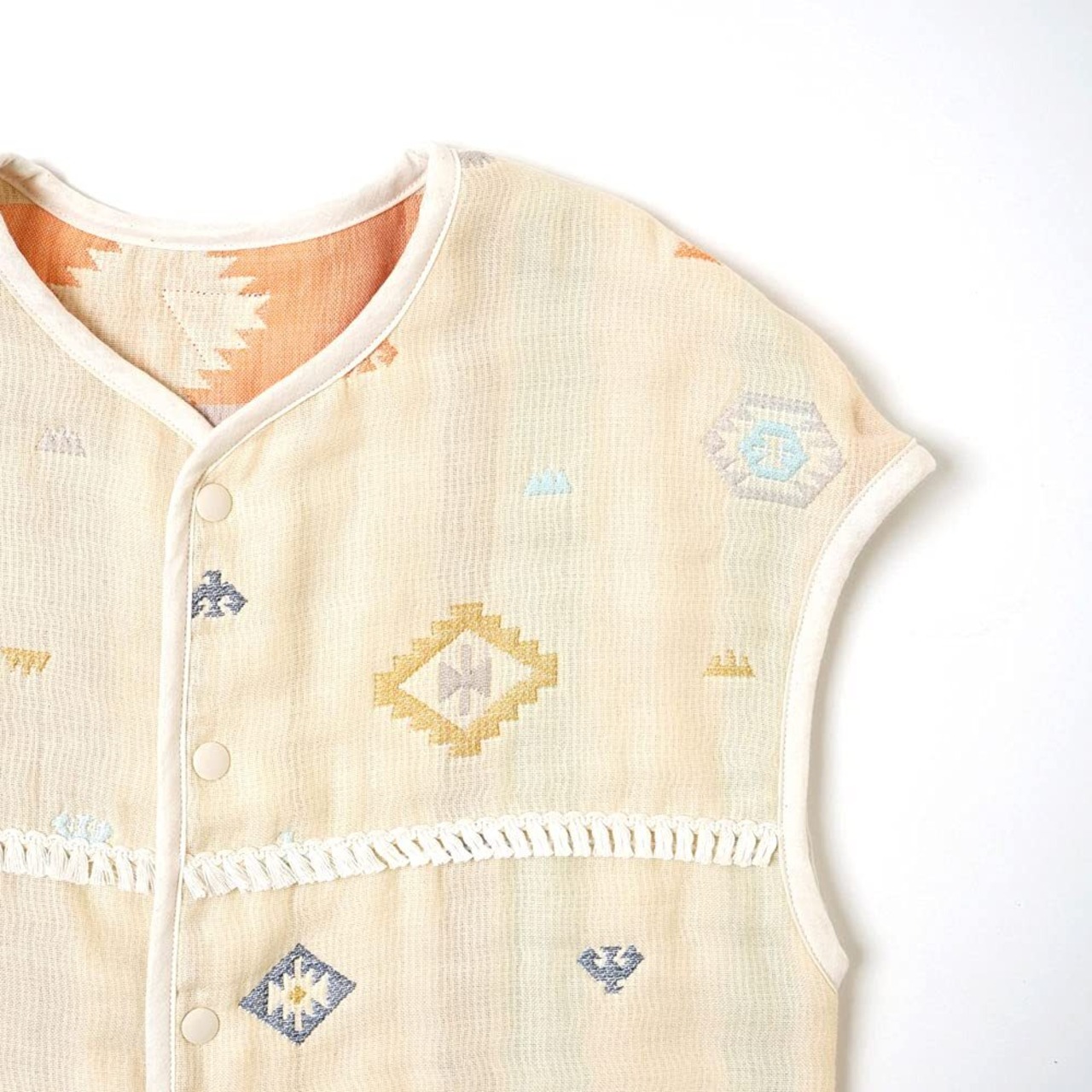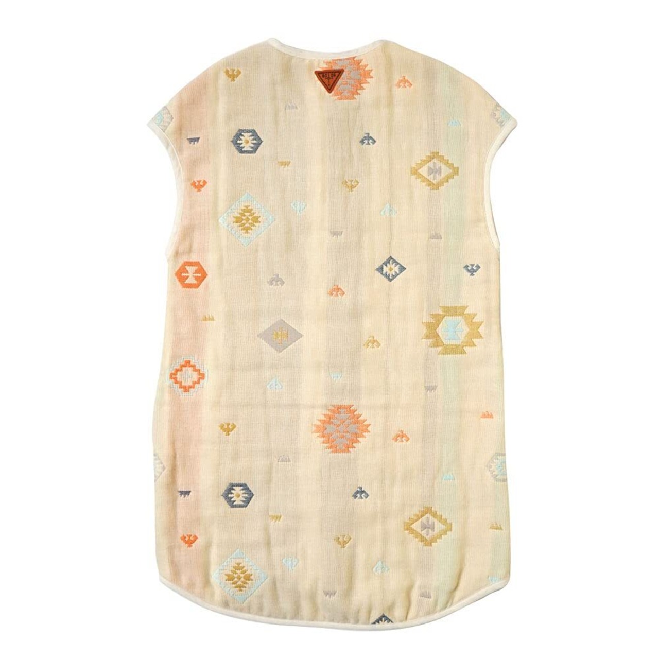 ジュニアサイズが遂に誕生! 7~10歳まで着られるジュニアスリーパー。織目の密度が異なるガーゼを6層に重ねることで、ふんわり空気を含み、寒い時は保温性を発揮し、暑い時は汗を素早く吸収しさらさら。寝冷え防止に1年中活躍し、お布団からはみ出しても安心。ボタンを止めて、簡単に着られるベスト型です。昔から織物が盛んな愛知県三河地方の高い技術力とこだわりを結集して作りました。2018年には「おもてなしセレクション」を受賞した「ふくふくガーゼ」は、ご自宅用にもギフトにもおすすめです。トーテムとは、部族・氏族ごとに守護神として信仰されている動植物や、それらを造形化した紋章のこと。「赤ちゃんが家族とともに、健やかに育ちますように」という願いをネイティブアメリカンの特徴的な柄に込めたシリーズです。豊かさの象徴とされる山や、願いを神様に届けてくれるイーグル(鷲)などネイティブアメリカンにとって幸福のモチーフもちりばめられています。