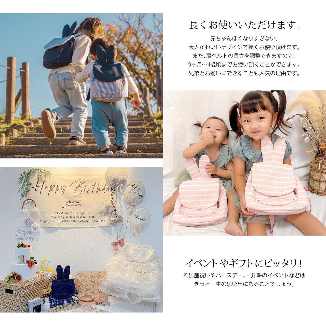 ベビーリュックならe.x.p.japon(イー・エクス・ピー・ジャポン)!長く使える機能性とデザイン性を兼ね備え、細部の縫製にまで拘ったブランド基準品質で出産祝いやギフトにもおすすめです。ウサギの耳を付けたバニーベビーリュックはシンプルなデザインにかわいいをプラス肩ベルトを調整すれば9ヶ月頃~4歳頃までご使用頂けます。赤ちゃんに触れる背中やベルト部分は、メッシュ素材で通気性も良く快適設計。また、リュックの内側に背面ポケットが付いており、夏は保冷剤、冬はカイロ等を入れて背中から体温調整ができます。チェストストラップは、お子さんがむやみに取り外しが出来ないように少し固め設計。一升餅にも対応可能なサイズで1歳のお誕生日プレゼントにも喜ばれること間違いなし!お洒落なデザインでオシャレママとコーディネートもお楽しみ頂けます◎お好きなワッペンやバッチを付けてお好きなアレンジにも