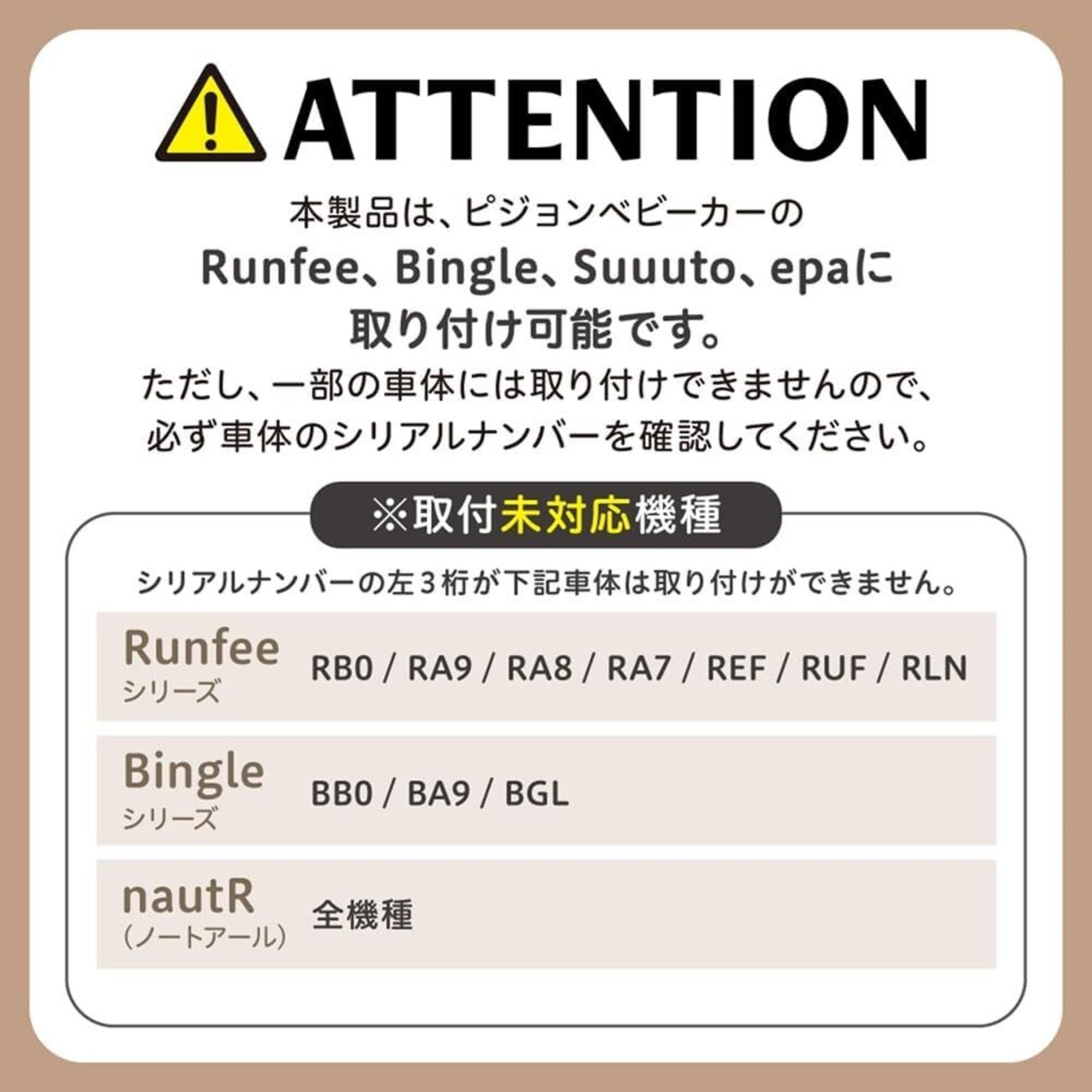 本製品は、ピジョンベビーカーのRunfee、Bingle、Suuutoシリーズに取り付け可能です。ただし、一部の車体には取り付けできませんので、必ず車体のシ