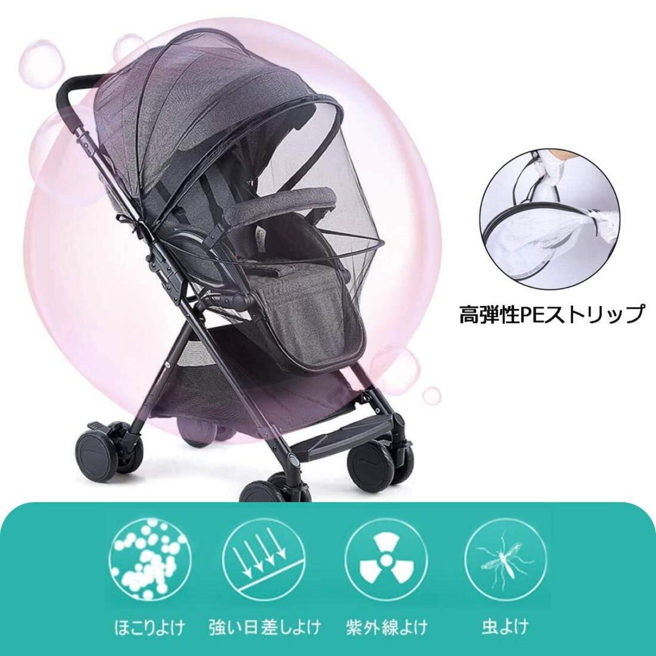 【蚊や害虫虫除け】ベビーカー蚊帳は赤ちゃんを蚊や害虫から守るためのとっておきのアイテムです。夏の害虫、蝿、蚊などから守ってくれます。風にも強く、日よけにもなります。風強い日の危険物からも赤ちゃんを守ります。