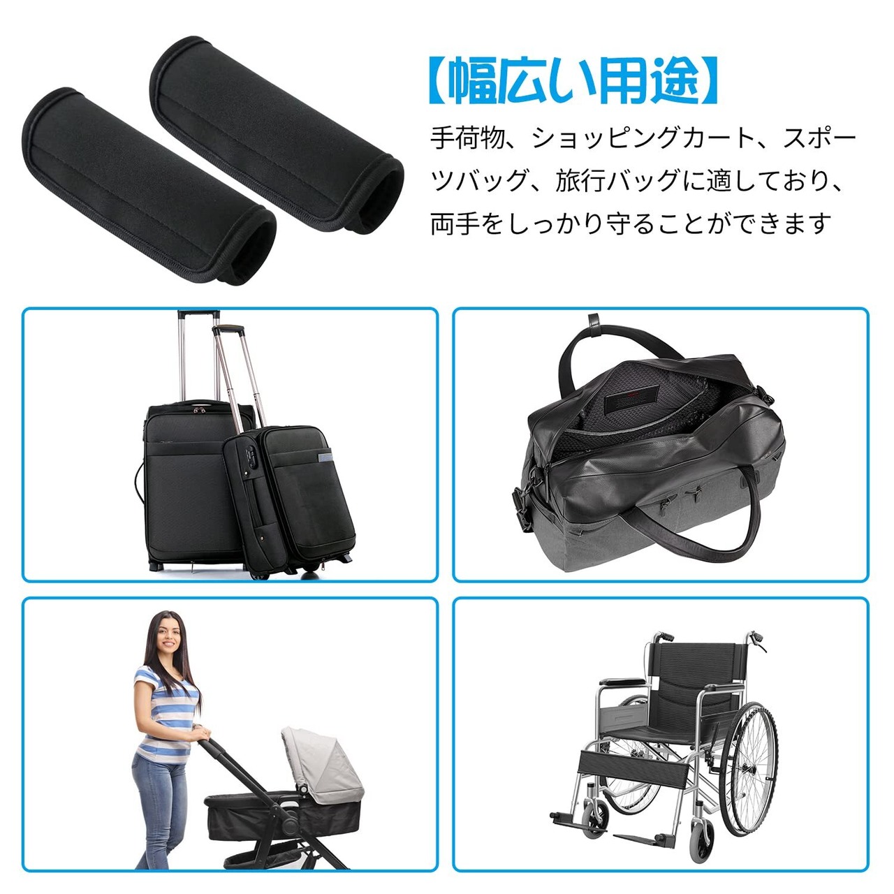 【使用方法】持ち手カバーがマジックテープで簡単に取り付け、とても便利です。持ち手カバーは、ハンドバッグ、カート、ベビーカー、ショッピングバッグなど、さまざまな荷物タイプに適しており、手の疲れを緩和し、両手を不快から保護します。