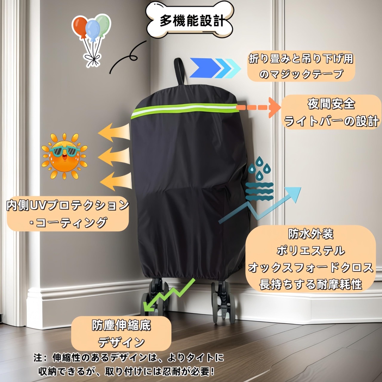 【玄関先・駐車場で大活躍 & 多重保護の安心感】:玄関先や駐車場で、ベビーカーをすっぽりと守ってくれる便利なカバー。夜間安全条付きで、暗い場所でも安心して使用できます。多重保護で、ベビーカーを様々な環境から守り、ママパパの強い味方です!