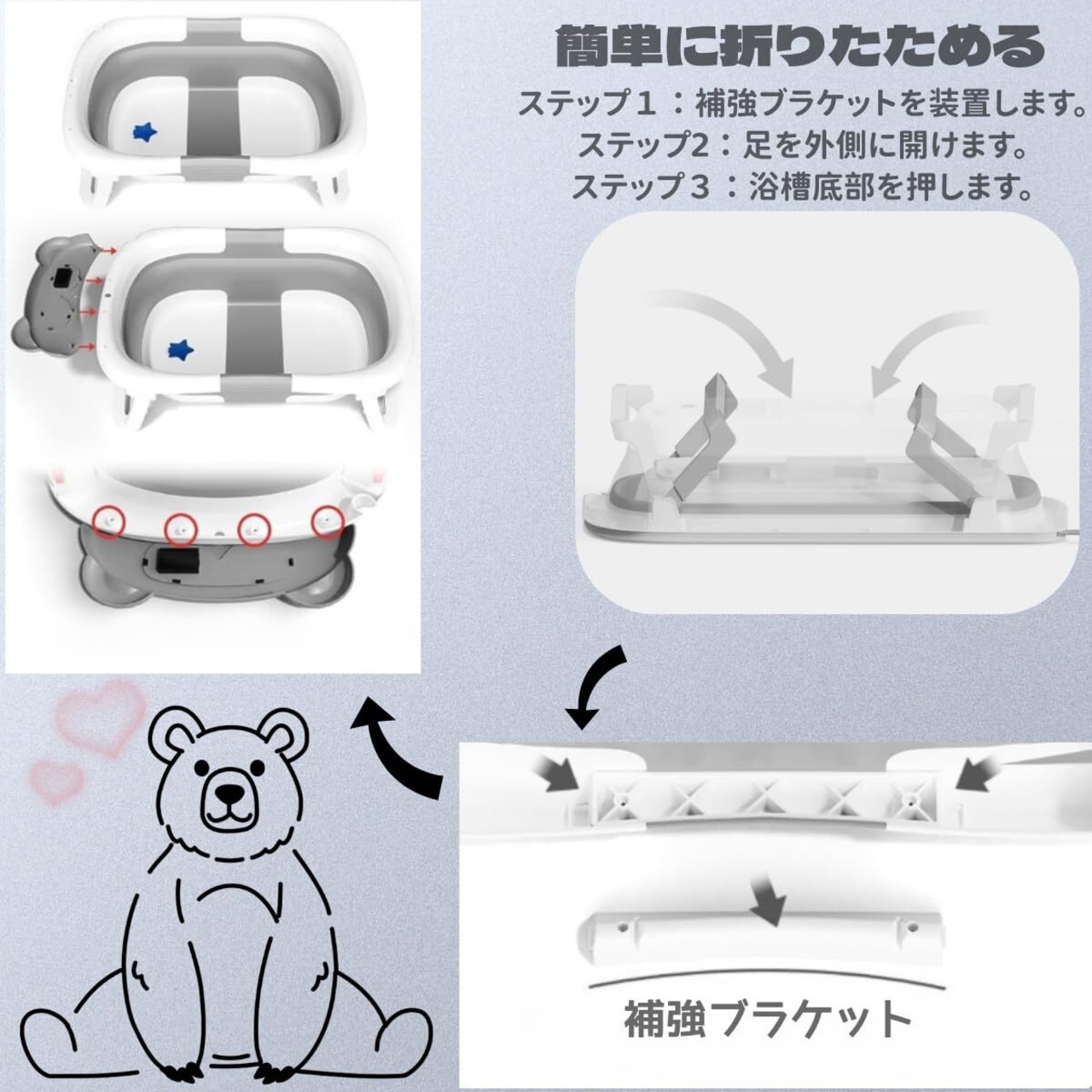 SHAKE BEAR® ベビーバス 折りたたみ式 ベビー用浴槽 湯温計 バスクッション付き 赤ちゃん 新生児 沐浴 ベビー お風呂 0~6歳 バスタブ コンパクト 水抜栓付 赤ちゃん用 出産祝い ギフト (グレー)