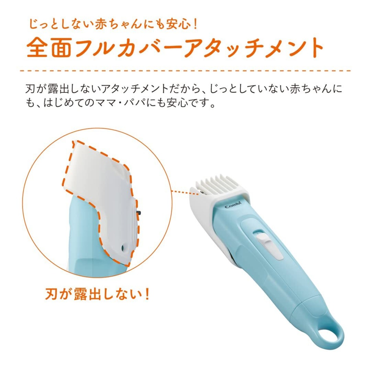 ●全面フルカバーアタッチメント 刃が露出しないアタッチメントだから、じっとしない赤ちゃんにも安心