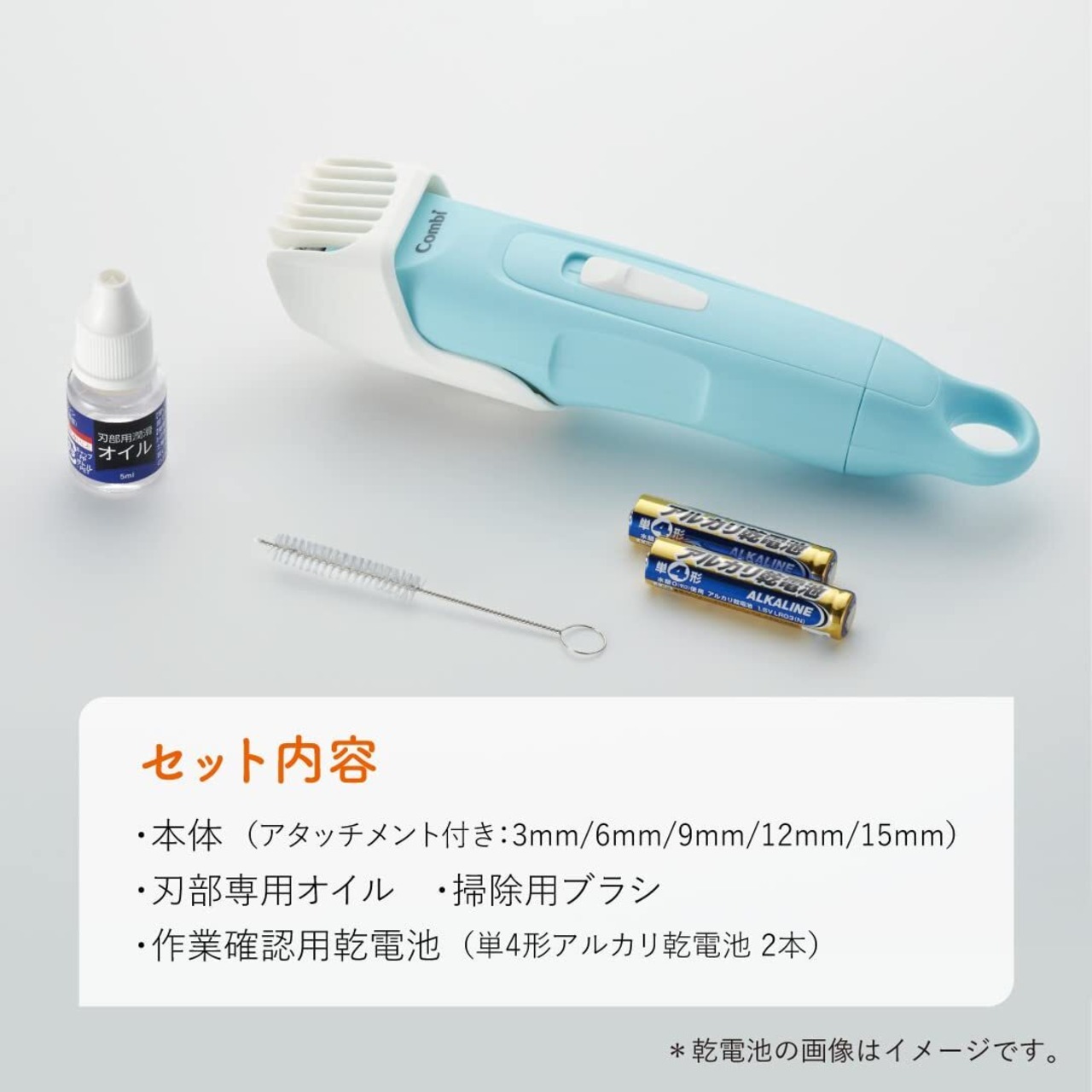 アタッチメント付き(3mm/6mm/9mm/12mm/15mm)/刃部専用オイル・掃除用ブラシ付き/乾電池式 単4アルカリ乾電池 2本(作業確認用乾電池2本付属)