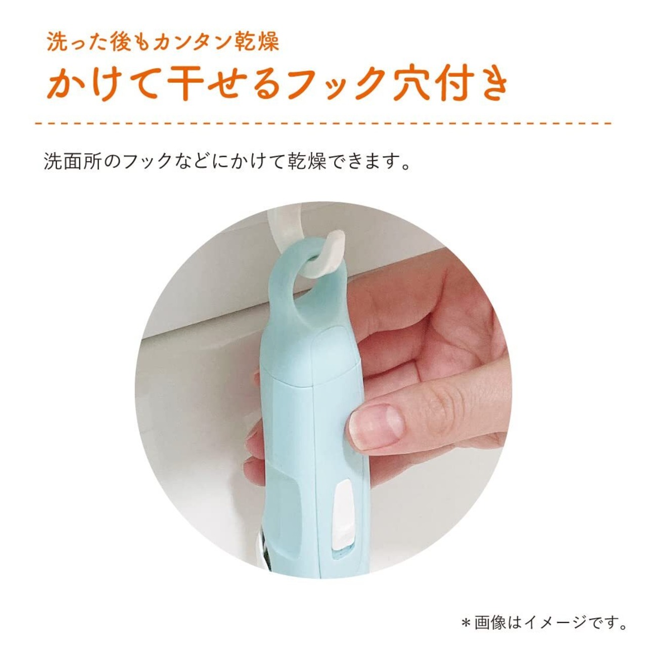 水洗いOK、洗った後も本体にフック穴があるので洗面所のフックなどに掛けて乾燥できます。