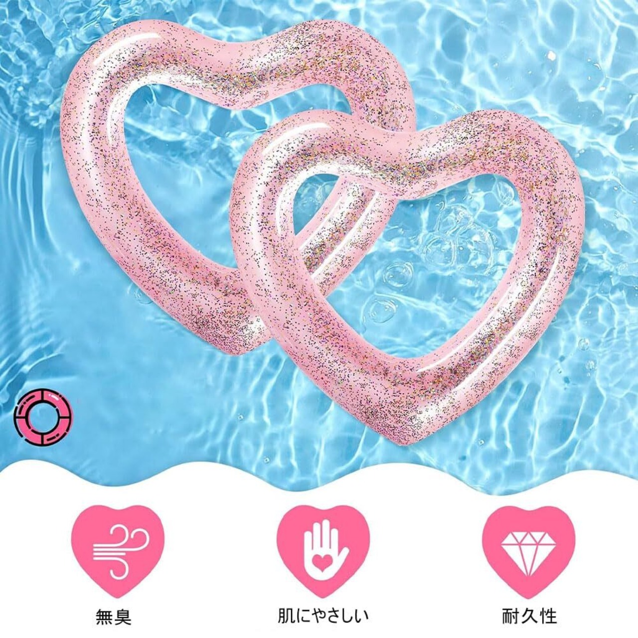 【輝くデザイン】このハート型の浮き輪は輝くパーツで飾られ、個性的で目を引きます。水面であなたの個性を存分に表現し、プールやビーチで注目されます。