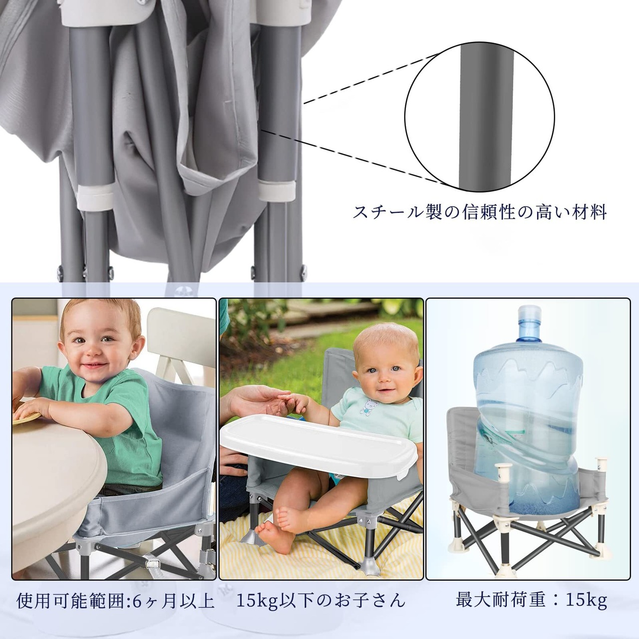 【折りたたみ式ベビーチェア】15kgの重量に耐えることができます。適用年齢:約6ヶ月~36ヶ月までの一人で座れるようになった幼児。ご注意:一人でお座りができるようになってからお使いください。お子様だけでのご使用はおやめください。ご使用の際は、必ず保護者の方が設置してください。