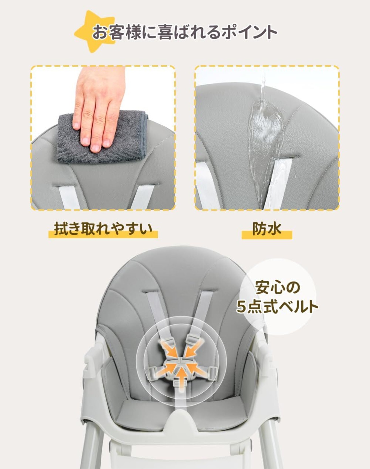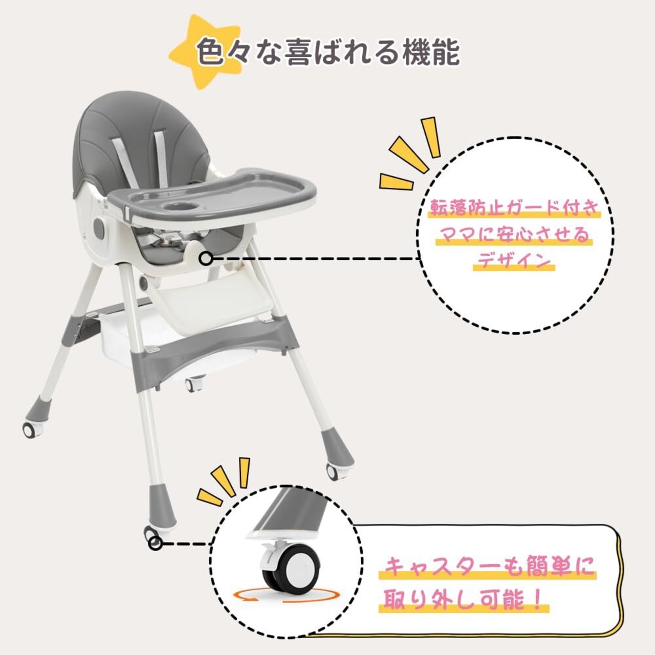 【5点式保護ベルト・収納かご付き】お子さまの落下を防ぐ安全ベルト付きで、離乳食を始めたばかりの月齢の低いお子さまでも安心してお使いいただけます。収納かごが付属していて、オムツ、哺乳瓶やおもちゃんなどをそれぞれ入れ安くて、空間を十分に利用できます。