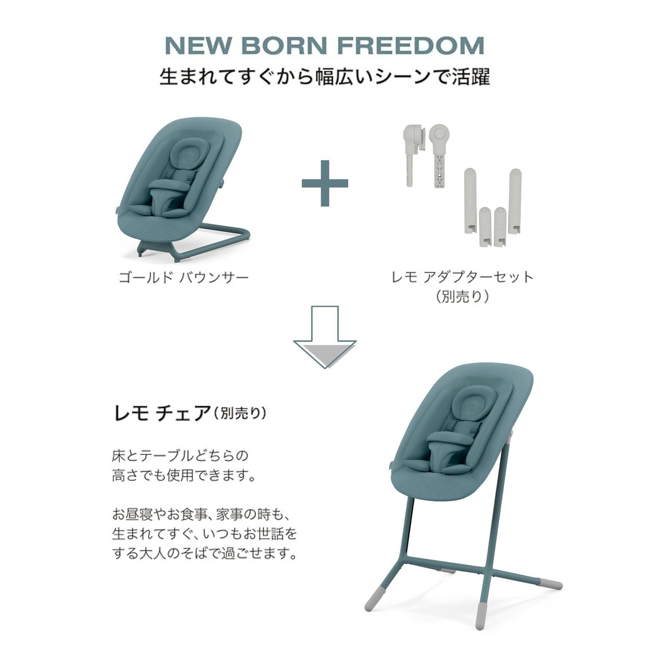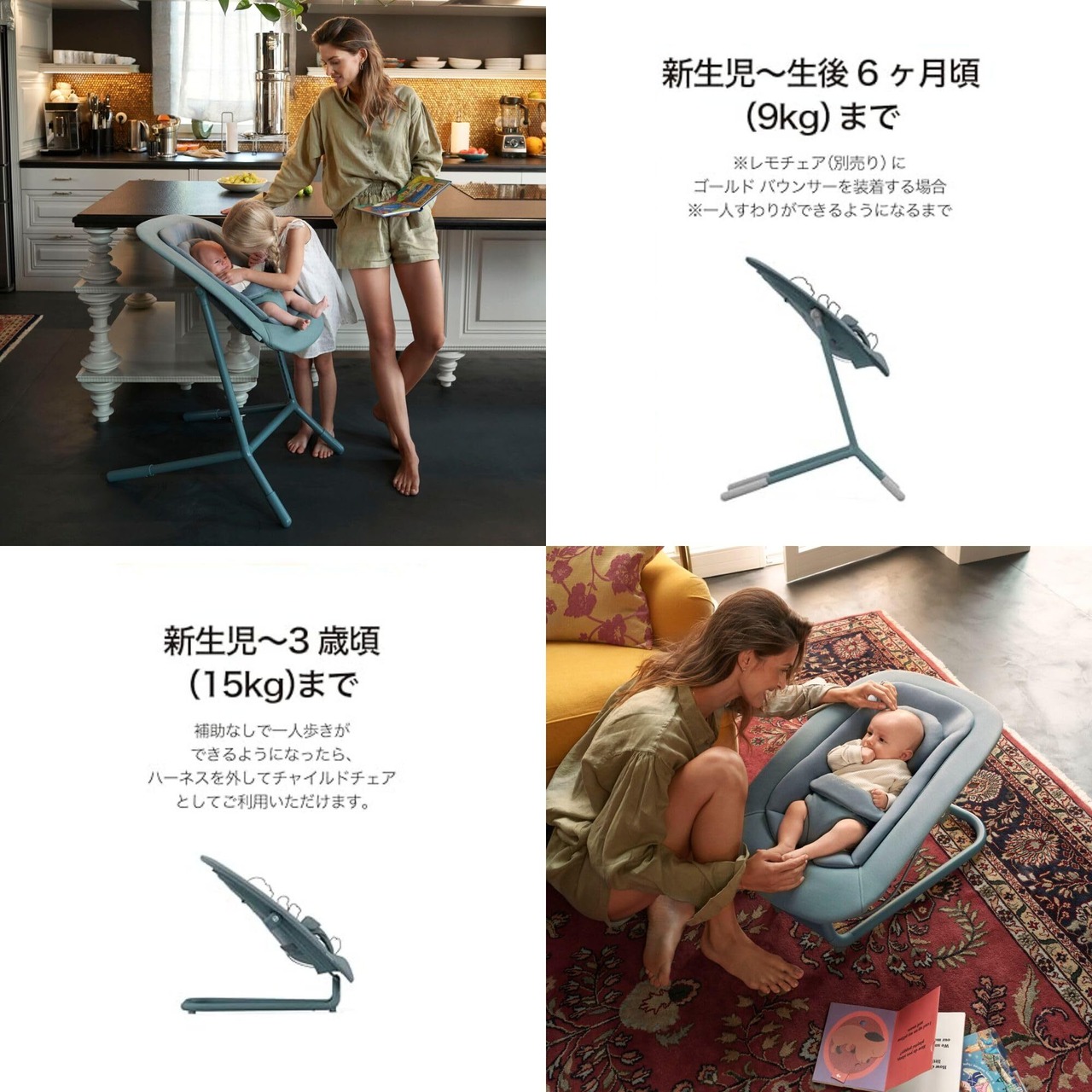 レモチェア(別売)のベースフレームに装着することで、ゴールド バウンサー(別売)をチェアと組み合わせて使うことができます。