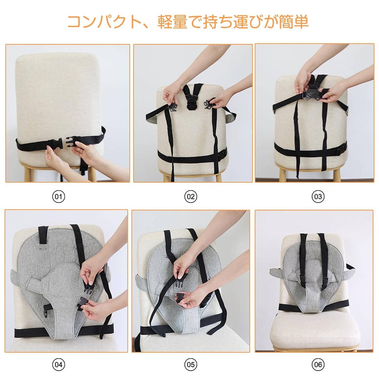軽量でコンパクトなハーネスシートは折りたたんでバッグに収納できるので、外出先でも簡単に持ち運ぶことができます。