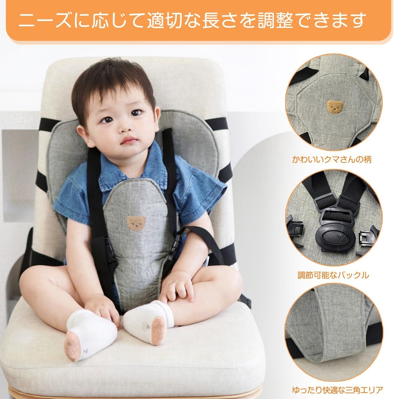 3本の高さ調節可能なストラップは生後6か月から3歳までの赤ちゃんにフィットします。