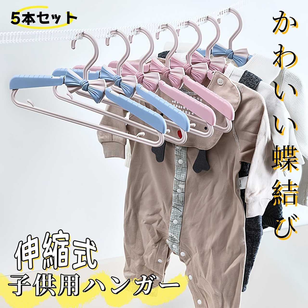 Orirya ハンガー ズボンハンガー 洗濯ハンガー かたくずれ防止 かわいい蝶結び付き 伸縮式 ベビーハンガー 滑らない 調節可能28.5~36.8cm 5本セット ピンク