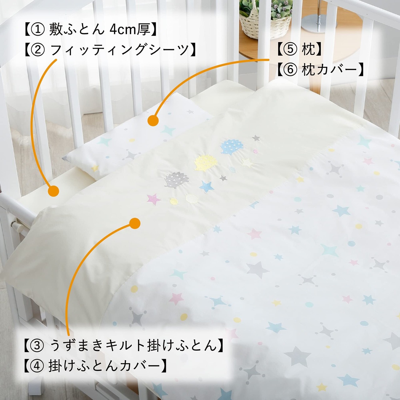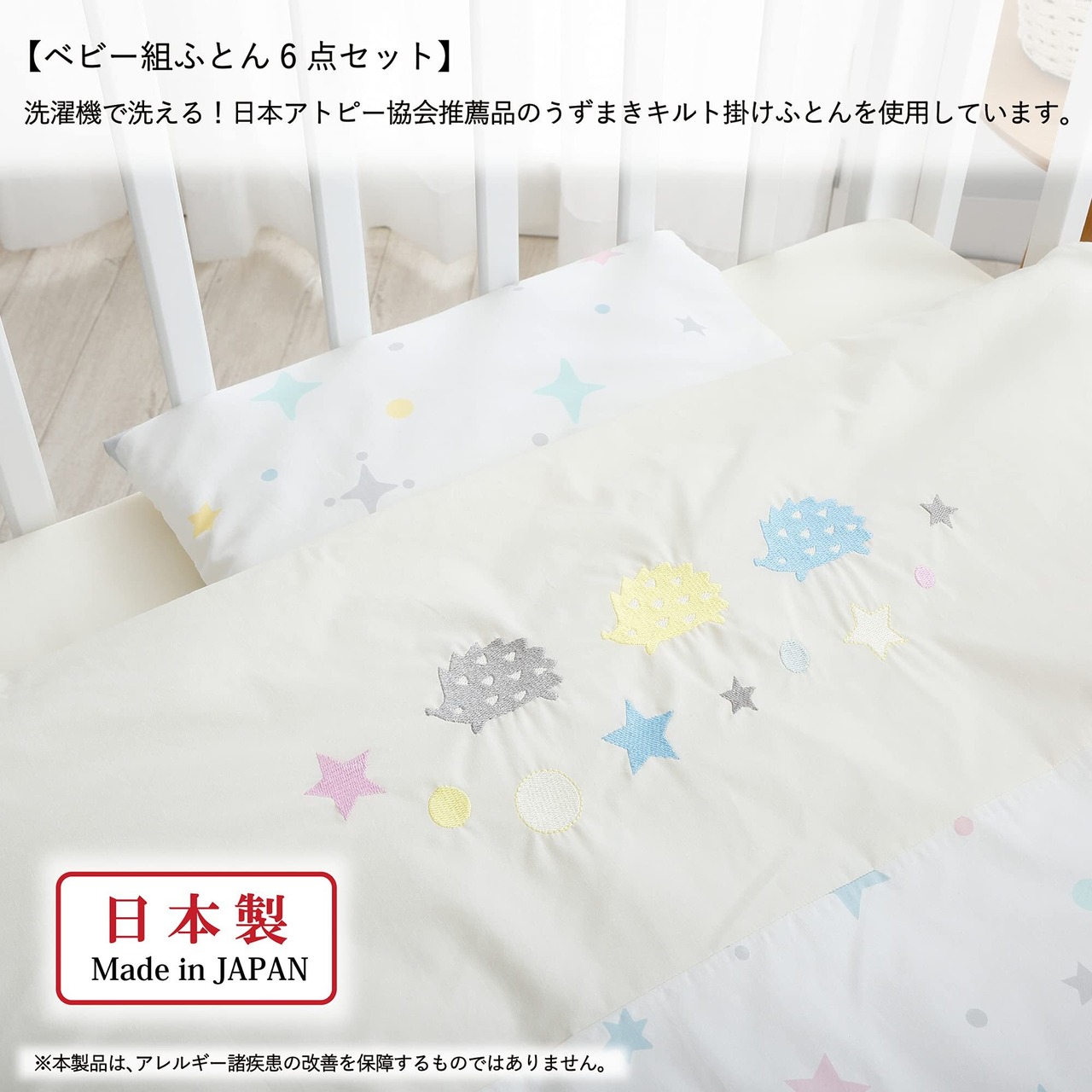 ハリネズミとお星さまが並んだ可愛いデザイン。優しいパステルカラーでお部屋も可愛く、赤ちゃんの健やかな眠りに寄り添います。