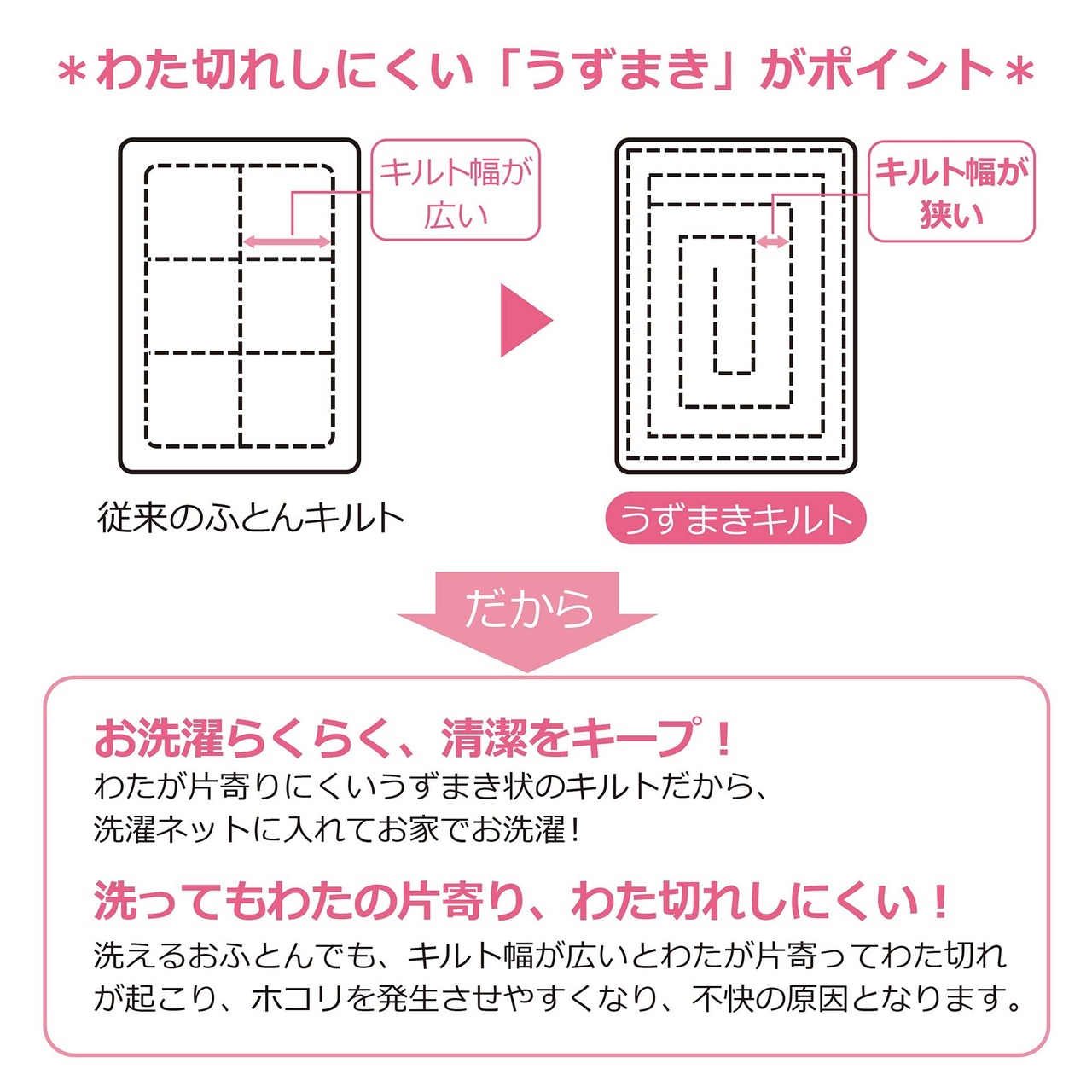 ●うずまきキルト掛け布団は洗濯機OK。キルト幅が狭いので、中に入っているわたが片寄りにくく、お洗濯してもわたが片寄ったり、わた切れしにくいのが特徴です。