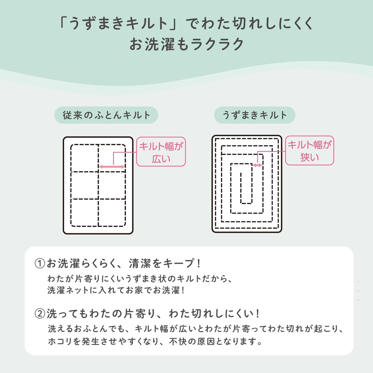 赤ちゃんの為に開発されたクリーンな掛けふとん、うずまきキルトの掛け布団。洗濯ネットに入れてご家庭洗濯が可能です。更に、うずまき状のキルトでホコリの原因にもなるふとんの「わた切れ」・片よりを防ぎます。