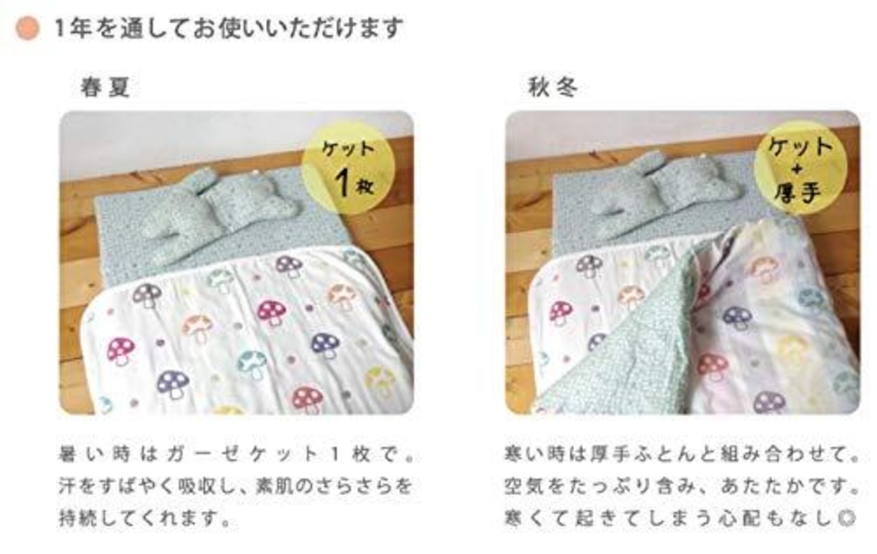 大人気の6重ガーゼケットに、新柄が加わりました。‘champignon (シャンピ二オン)とはフランス語で‘きのこ’の意味。カラフルなきのこのモチーフは裏地もかわいいチェック柄になっており、男の子、女の子を問わず使っていただけます。夏はさらさら、冬はあったか。1年中使える6重ガーゼは贈り物にもお勧めです。また、洗えば洗うほどふっくらやわらかくなるのもうれしいですね。