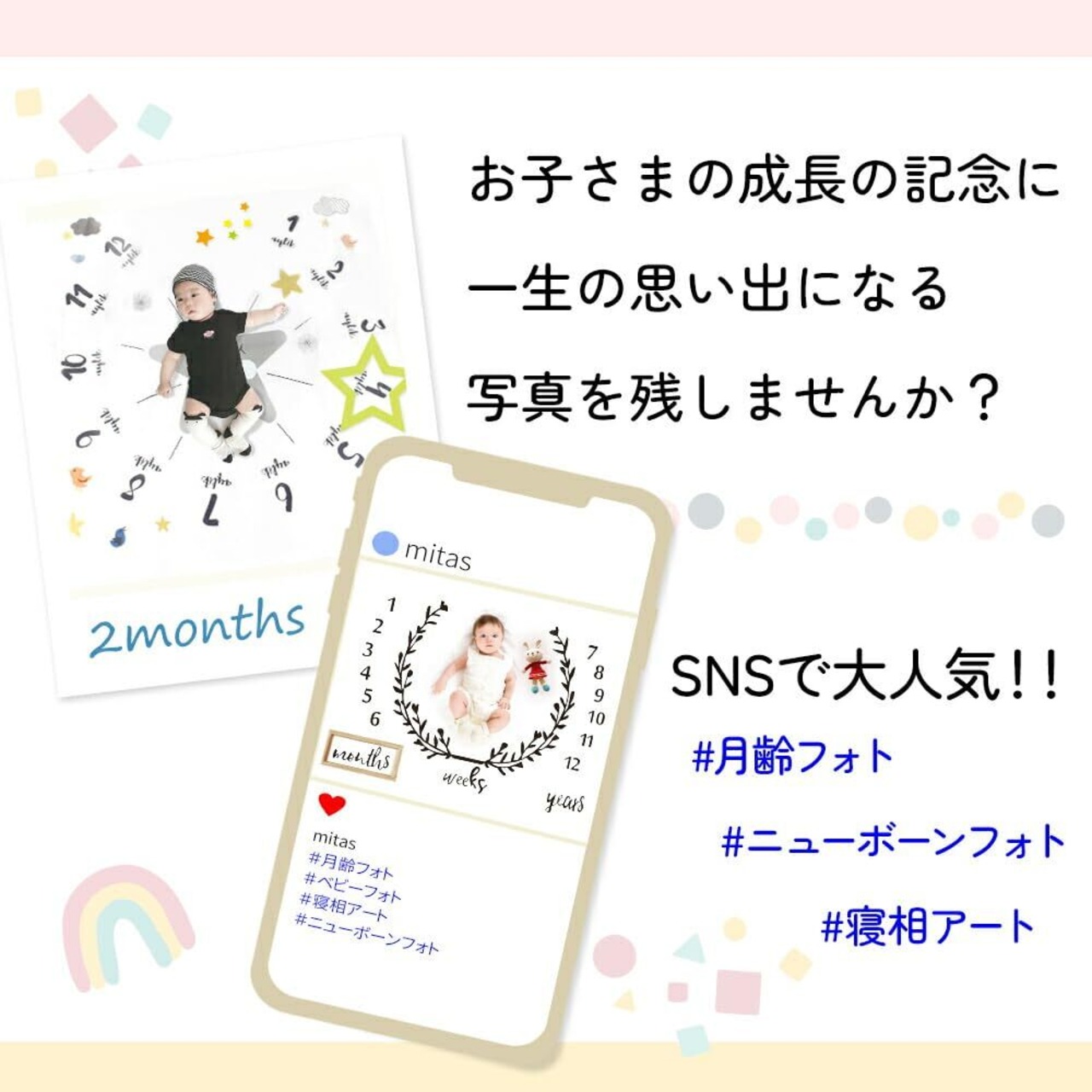 mitas 月齢フォトシーツ お昼寝アート 寝相アート 成長記録マット 撮影用シート 新生児から使える コンパクト収納可能 TN-PHOS-A