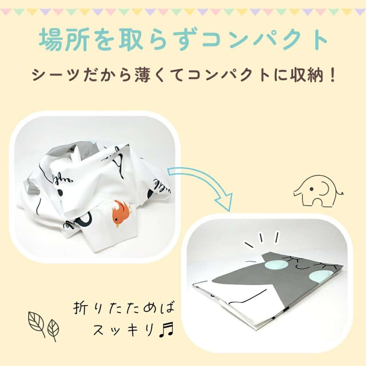 【使わないときは折りたたんでコンパクトに収納OK】シーツタイプだから薄くて軽量、場所を取らずにたためて収納も簡単。専用ケースに入れて持ち運びもできるから、里帰り先や旅行先などでも活躍。ベビーフォト専用のフォトマットとしてだけでなく、お昼寝シーツやブランケット代わりとしても使えるのが嬉しいポイント。日々の育児の合間にも使いやすく、洗って繰り返し使えるコットン素材でお手入れも簡単
