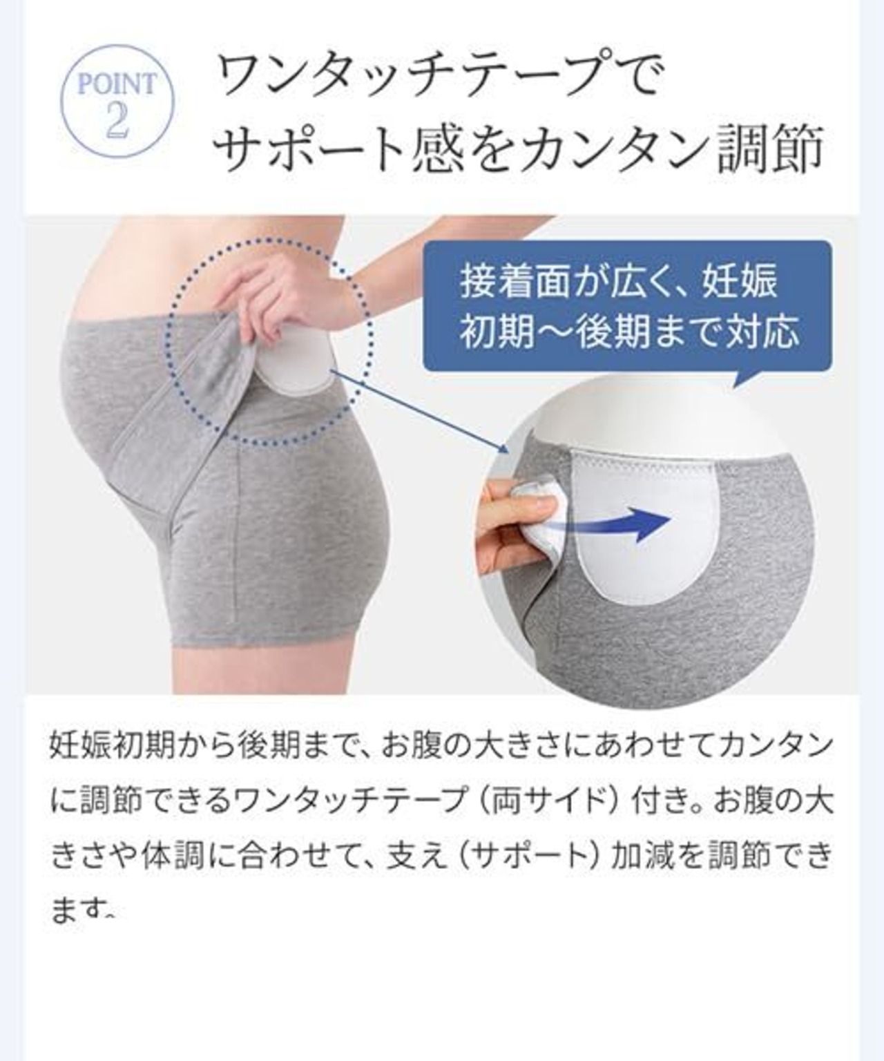 【オーガニック素材をつかったやさしい肌触り】サポートベルトの裏側のみパワーネットを使用し、適度なサポート力で快適さを重視したベルト調整付きのパンツ妊婦帯です。お腹が安定し腰への負担も軽減。オーガニックコットンを使用したベア天竺素材で、1枚履きもできるやさしい肌触りに仕上げました。