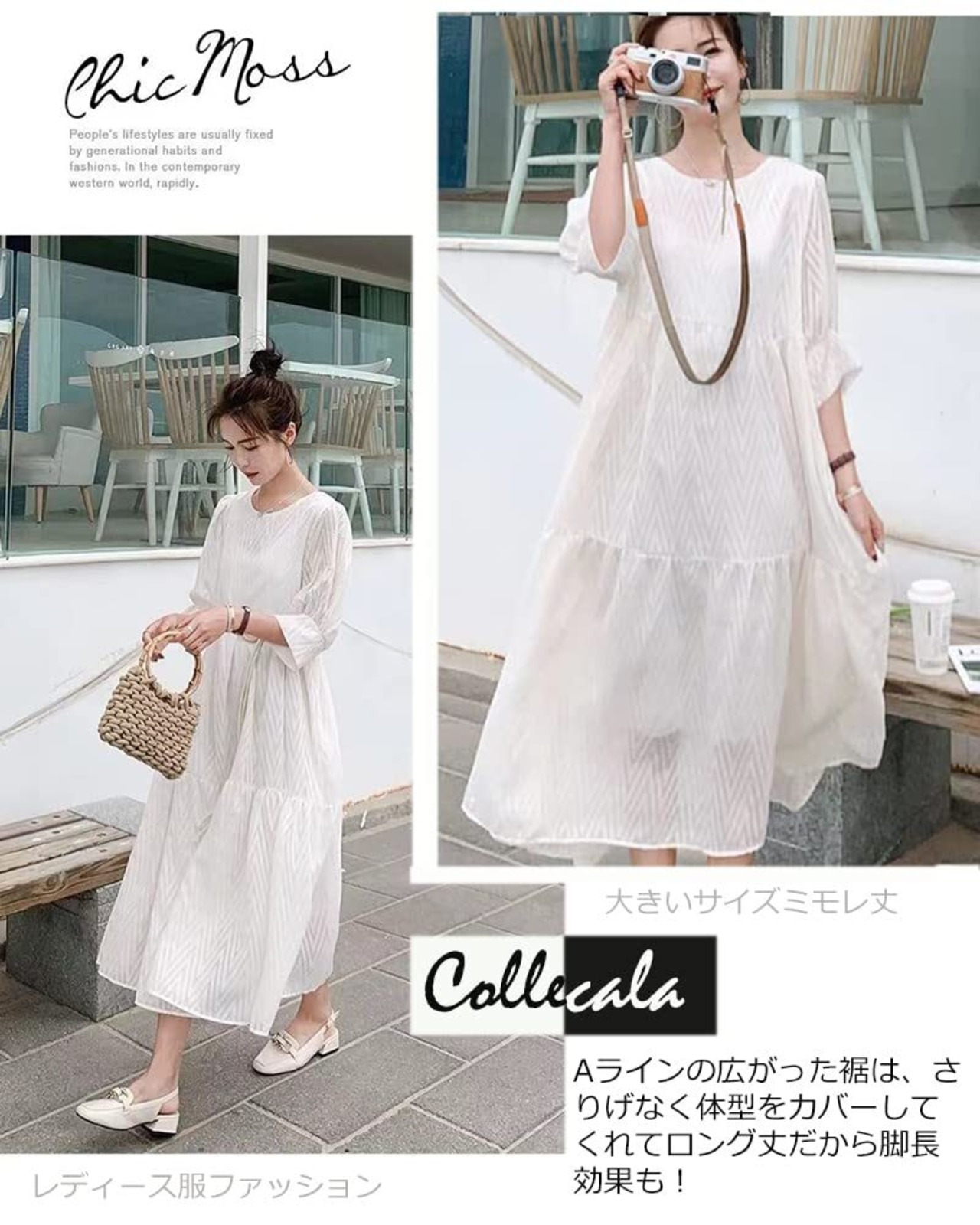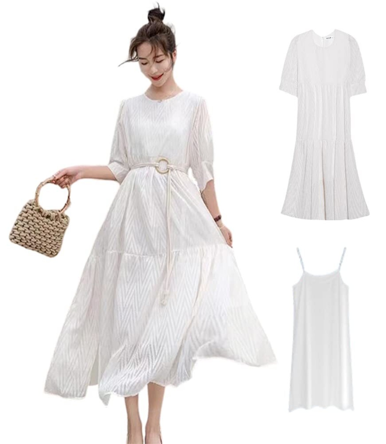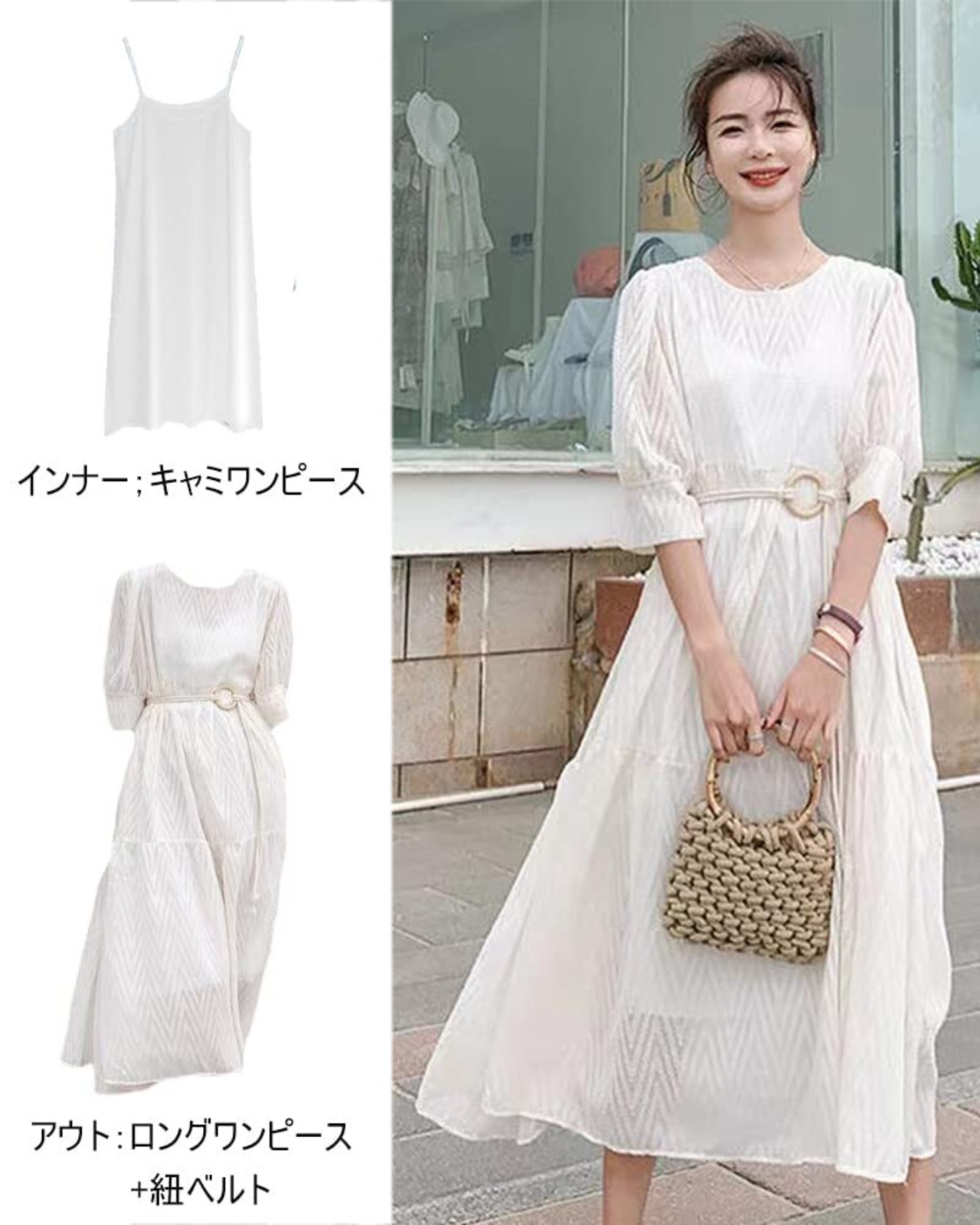 [Collecala] 白ワンピース レディース 夏 半袖マタ二ティオーバーサイズキャミわんぴーすセットアップ オフホワイト ふんわり ミモレロング サマ白ワンピースピース ロングワンピ キャミ+ワンピース+紐ベルト3点セット