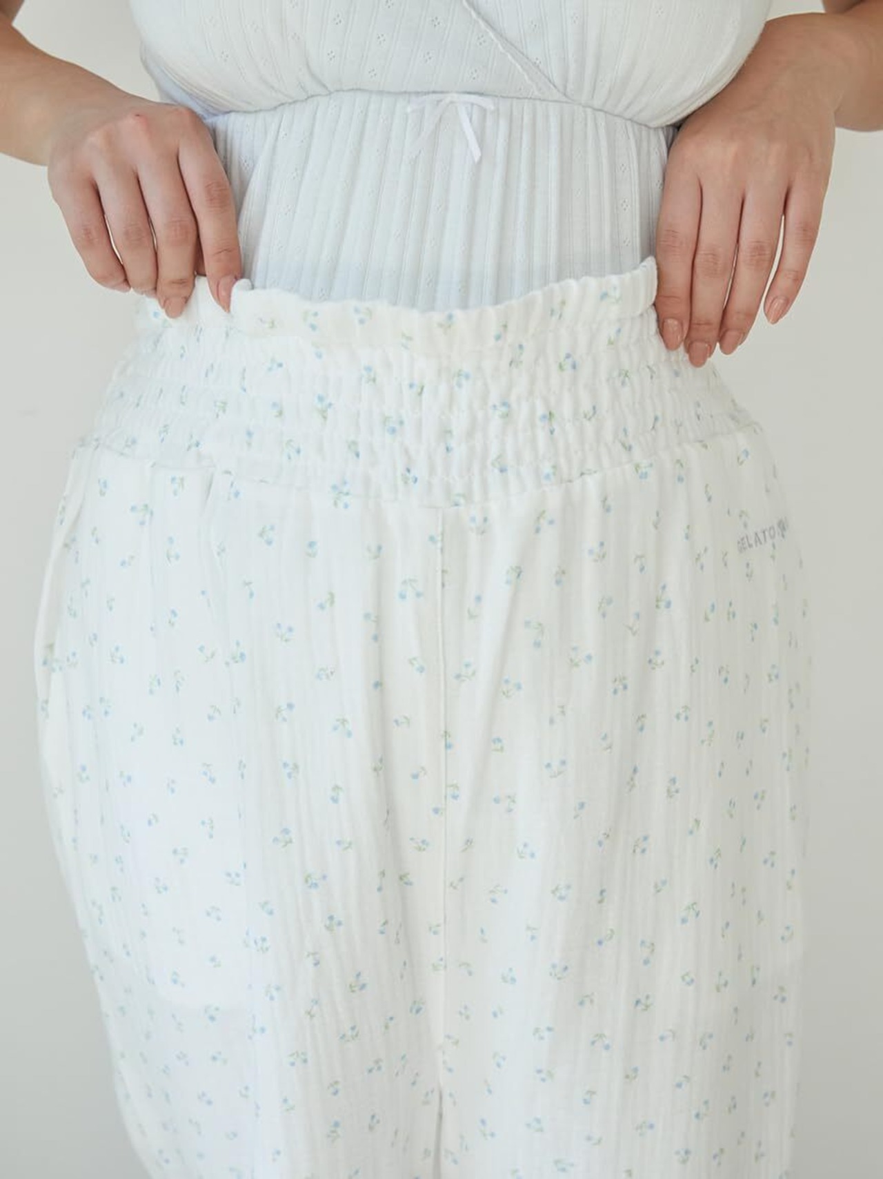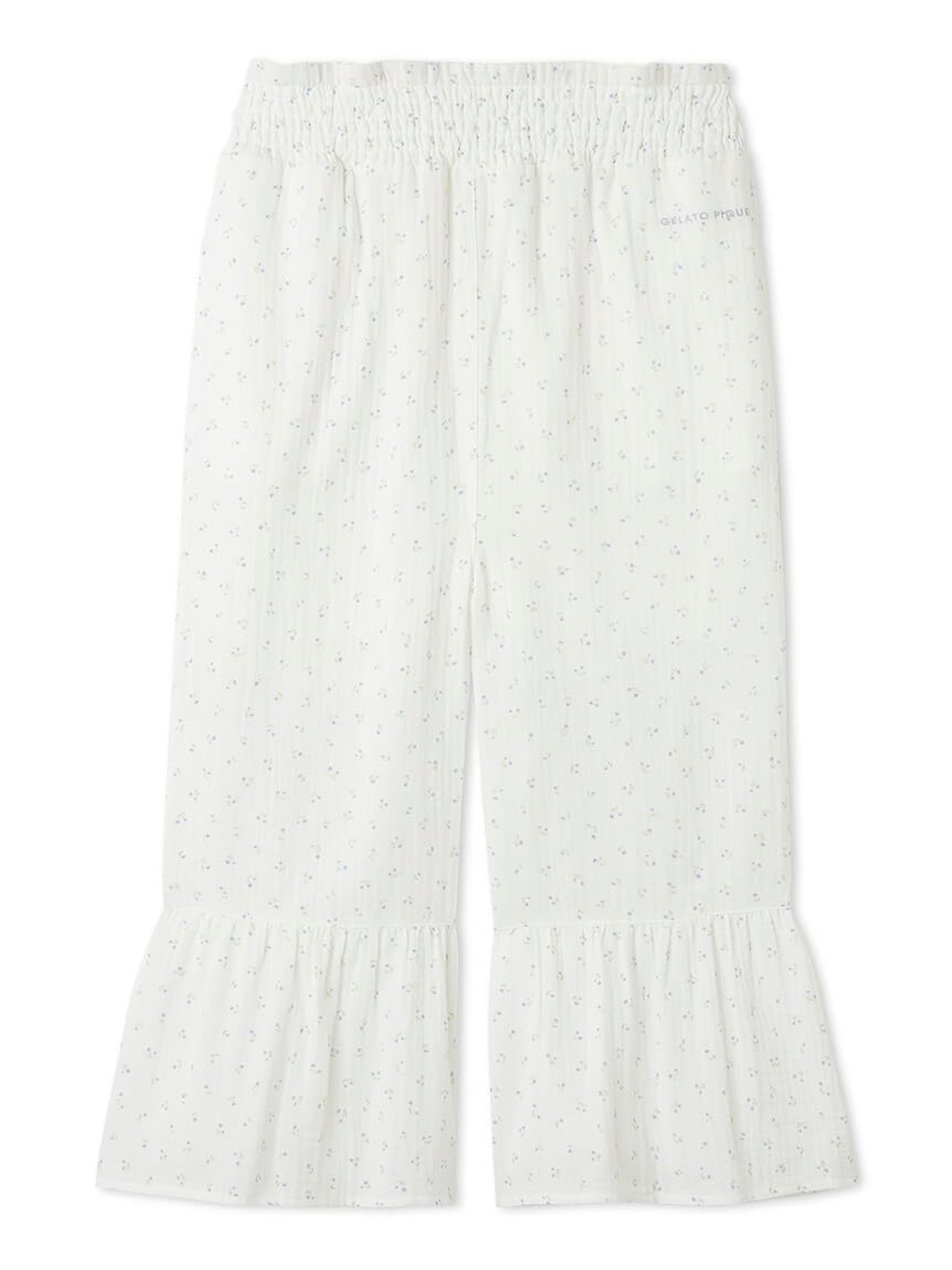 ソフトな風合いのダブルガーゼを使用し、季節感のある小花柄とストライプ柄で仕上げたマタニティシリーズです。ボリューミーなフリル裾の切り替えがフェミニンなロングパンツ。ウエストには幅広のシャーリングを入れ、優しいフィット感に。便利な脇ポケットも付けているので、マタニティのデイリーなルームウェアとして重宝します。腰元にはワンポイントでロゴ刺繍入り。色は小花柄のオフホワイトと、ストライプ柄の2色を揃えています。同シリーズのプルオーバーと合わせたり、KIDS、BABYサイズとのリンクコーディネートもお楽しみください。