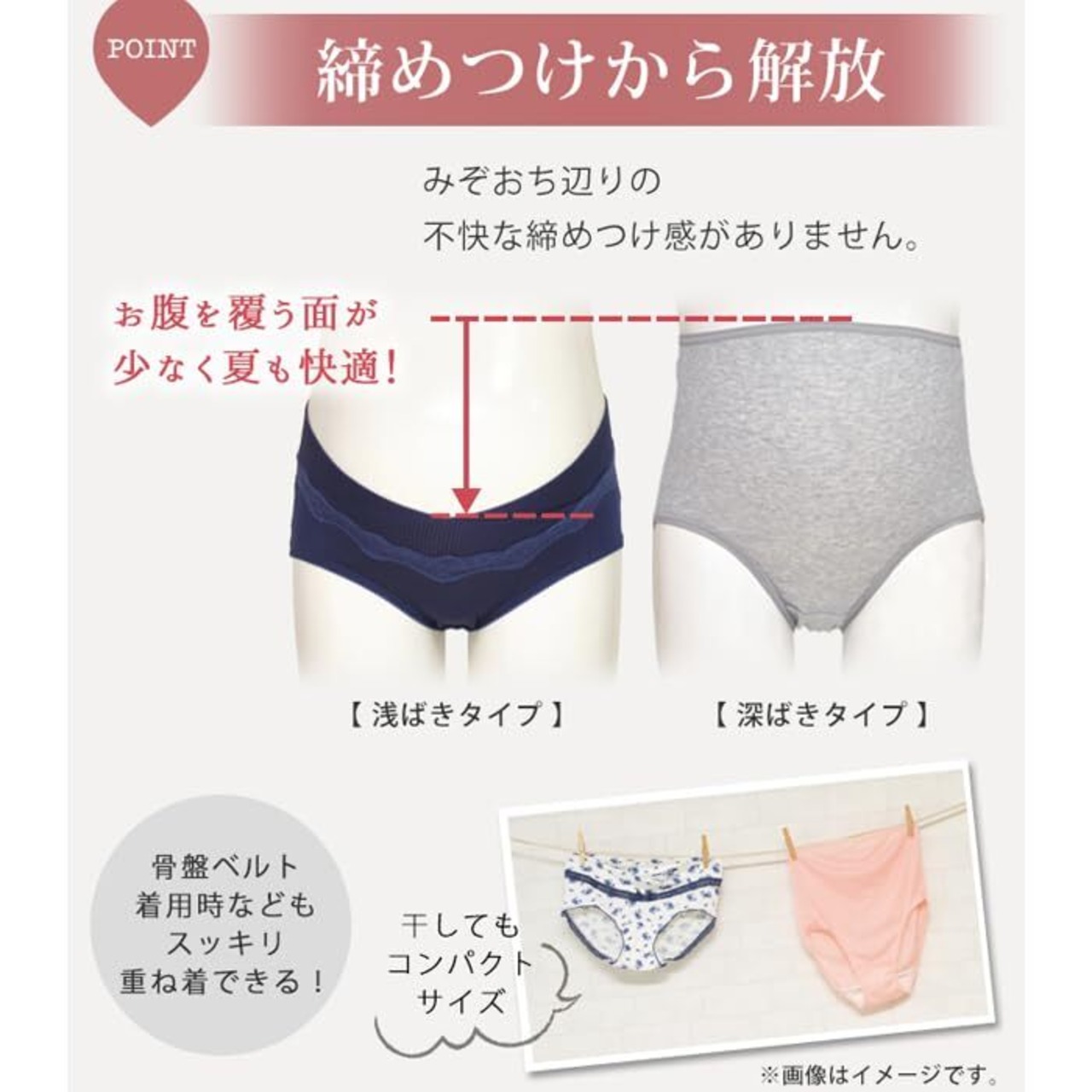 ゴムを使用せずパワーネットを身生地で包んだ広幅のウエストベルトは、大きくなるおなかに面でソフトフィット。身体にやさしい仕様です。浅ばきタイプのショーツなので、みぞおちあたりの不快な締めつけから解放され楽ちん。健診のエコー時にもスムーズです。計算されたウエストラインでフロントをすっきり見せ、後はヒップをすっぽり包む安定感のあるバックスタイル。妊娠中から出産後も長くご使用いただけます。ヒップレースは直接肌に触れにくい生地の上に重ねる仕立てに。見た目も機能も充実のアイテムです。