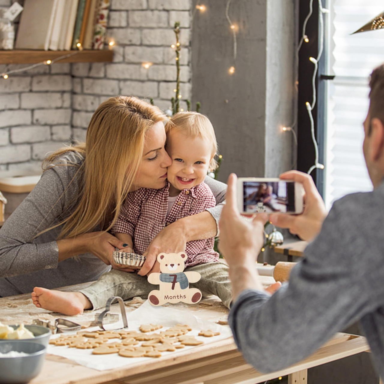 Promise Babe 月齢フォト ベビーマンスリーカード 7枚セット クマ形 ウッド 天然木材 ニューボーンフォト 写真道具 成長記録 新生児 赤ちゃん 出産祝い 収納袋付き