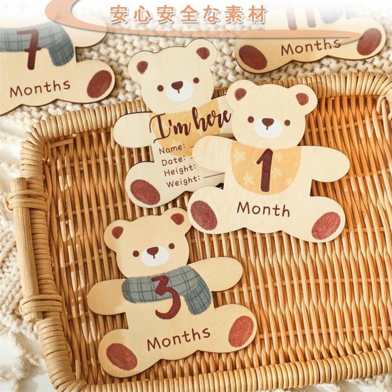 KALOLINNA 月齢フォト 木製 マンスリーカード 7枚セット クマ形 ニューボーンフォト 新生児 成長記録 写真記念の小道具 出産祝い 収納袋付き