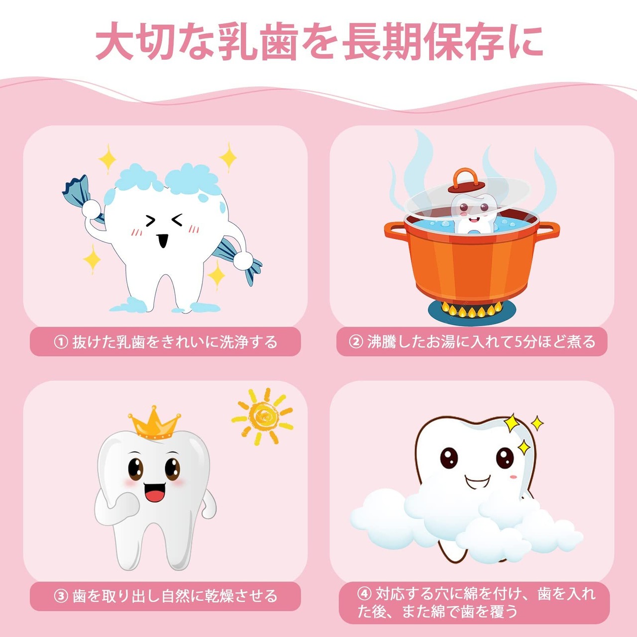 1. 乳歯をきれいに洗浄した上、沸騰したお湯に5分間ほど置きます。