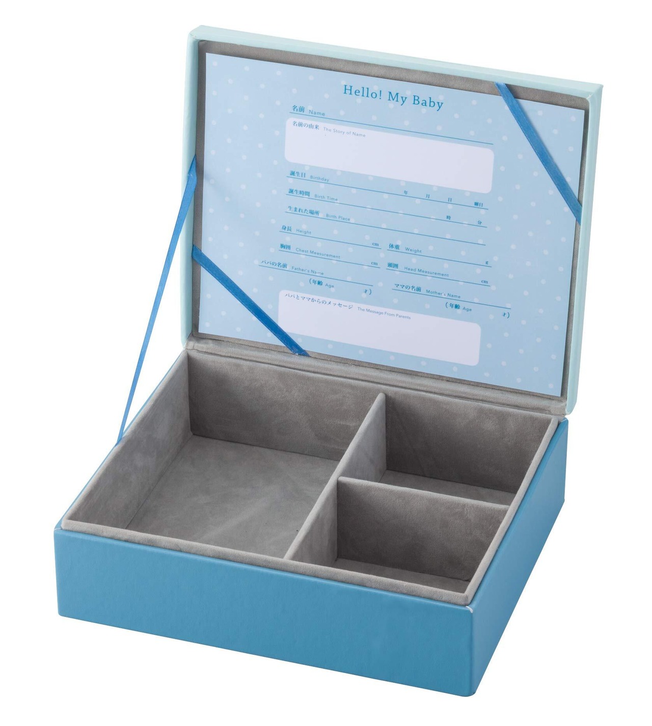 赤ちゃんの一度きりの大切な思い出を保管できるメモリアルボックスです。へその緒など、出産時の小物を入れて保管できます。フタの内側には赤ちゃんの名前の由来や、身長・体重などを書き込めるシート付き。出産祝いのギフトにもオススメです。
