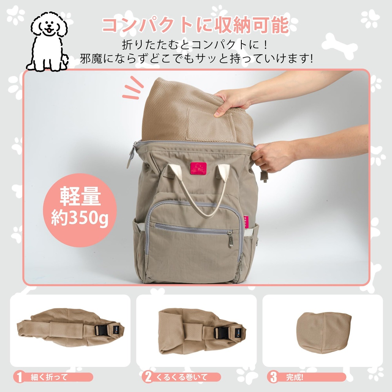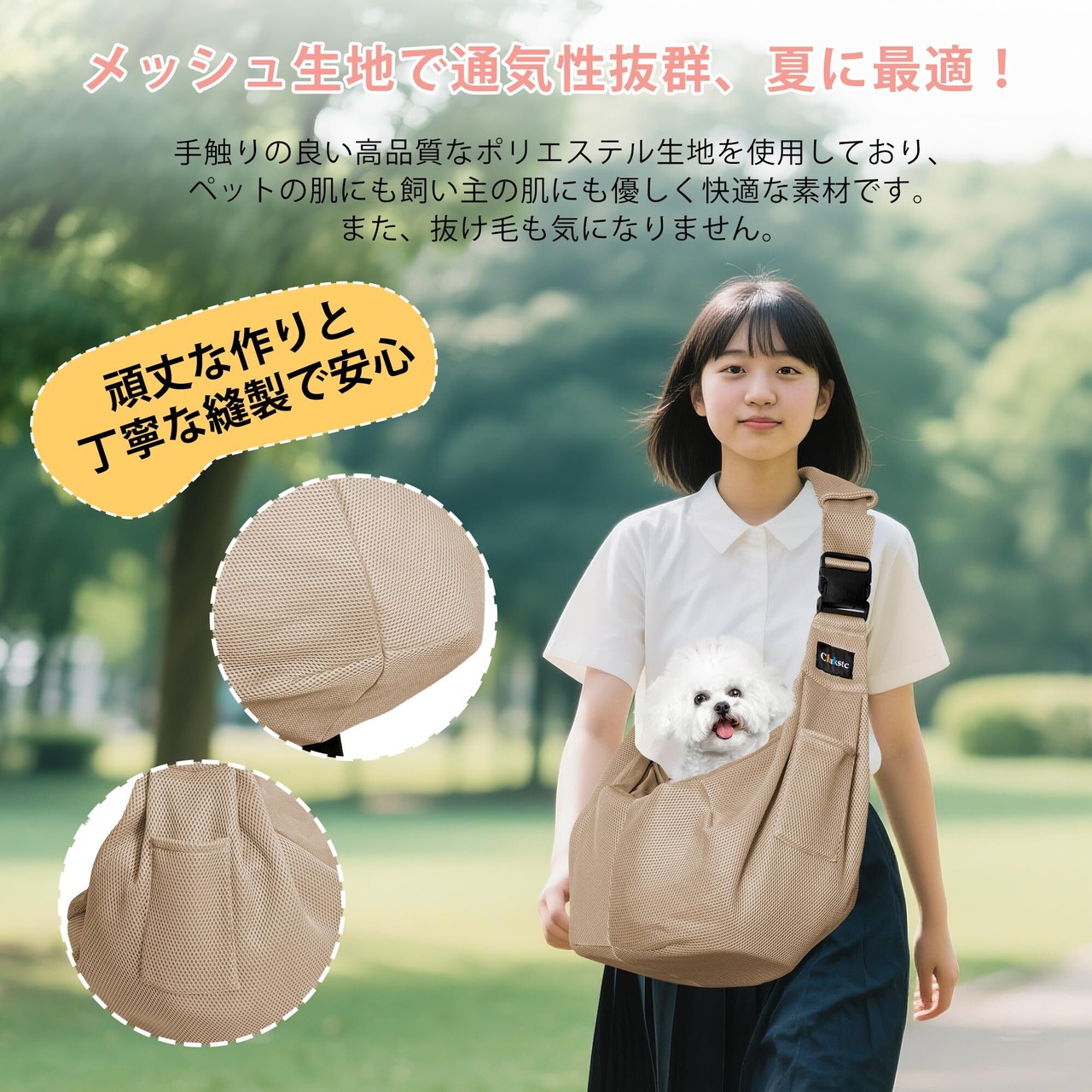 【夏にぴったりの犬用ペットスリング】夏にやさしいメッシュ生地でふんわりとした柔らかな素材が通気性抜群で、寝心地のよいスリングになっております。長旅や暑い夏でも心配なく手軽に使えます。通気窓があって、ペットが顔を出せます。