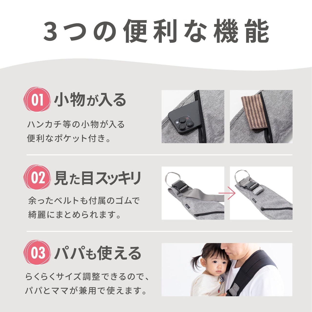 【ベルトもまとめて見た目スッキリ】調整ベルトの余った分は、くるくるとまとめて付属のゴムで綺麗に止められます。ぶらぶらと垂れ下がることはございません。【バックル外れ防止】バックルの上から安全バンドル(輪っか)を通す事で、もしもバックルが外れても大切なお子様を守ります。