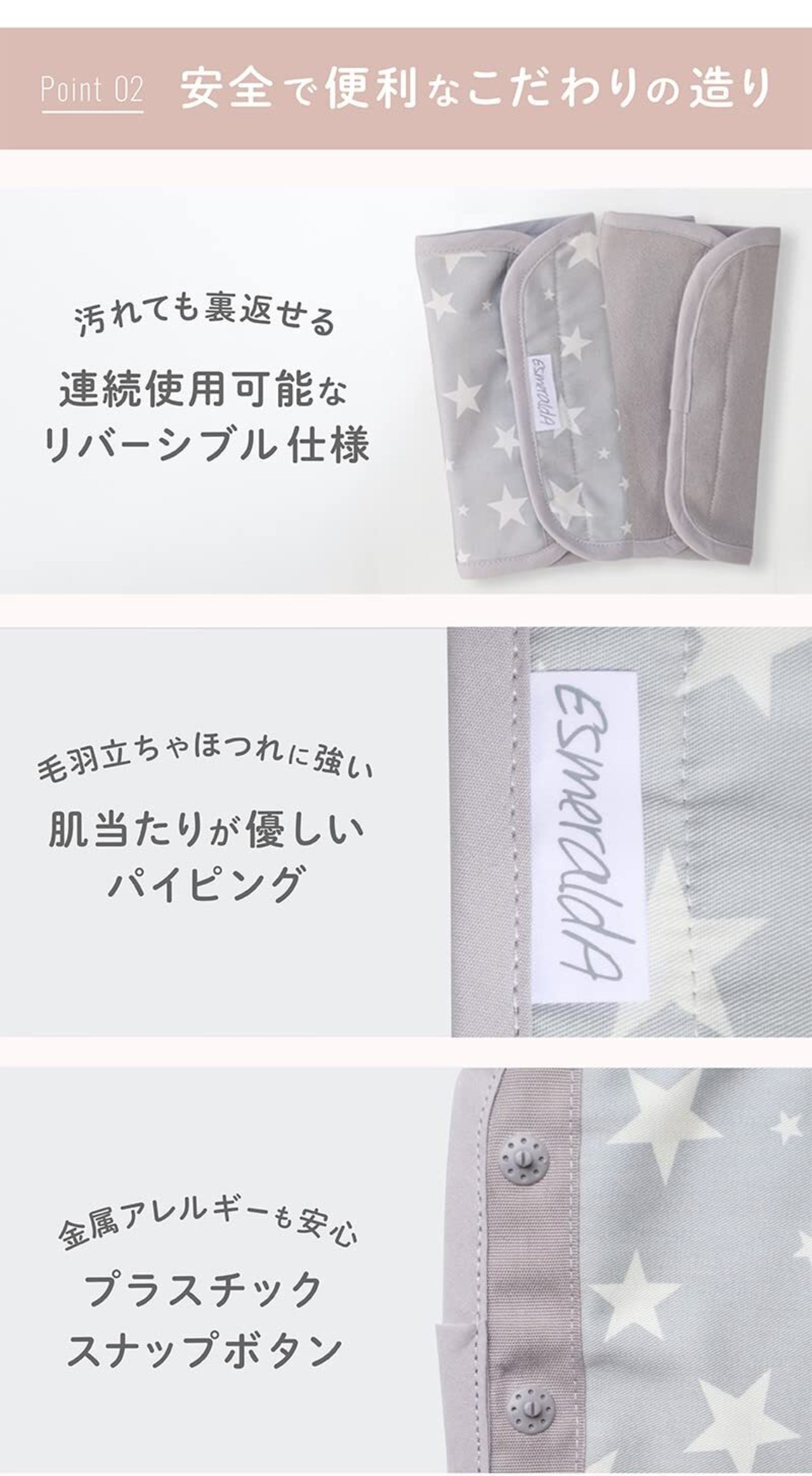 エルゴのベビーキャリアに似合うサッキングパッド・よだれパットです。お子様とのお出かけが楽しくなるようにリバーシブルで洗濯も可能。安全で上質な肌触りのオーガニックコットンを100%使用しています。金属ボタンでは錆が発生し、マジックテープだとお子様にチクチク感を与えます。そこで、留め具にもこだわりプラスチック製スナップボタンにすることで留めやすく安心してお使いになれます。