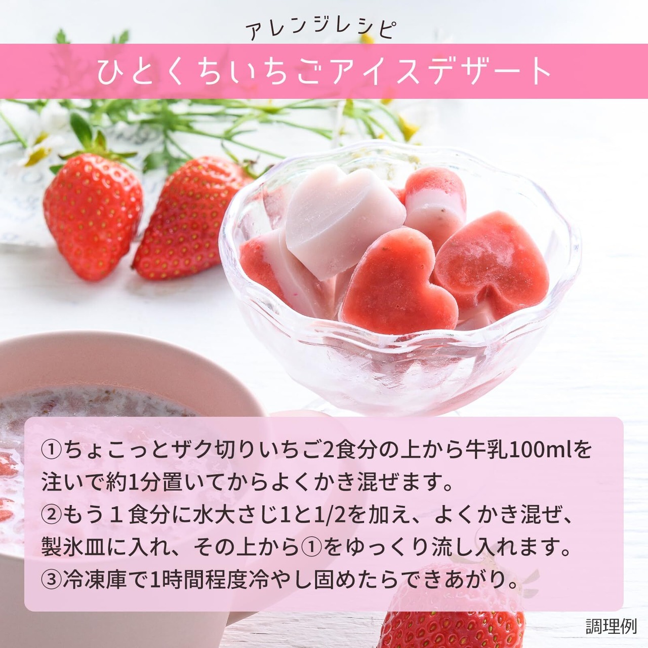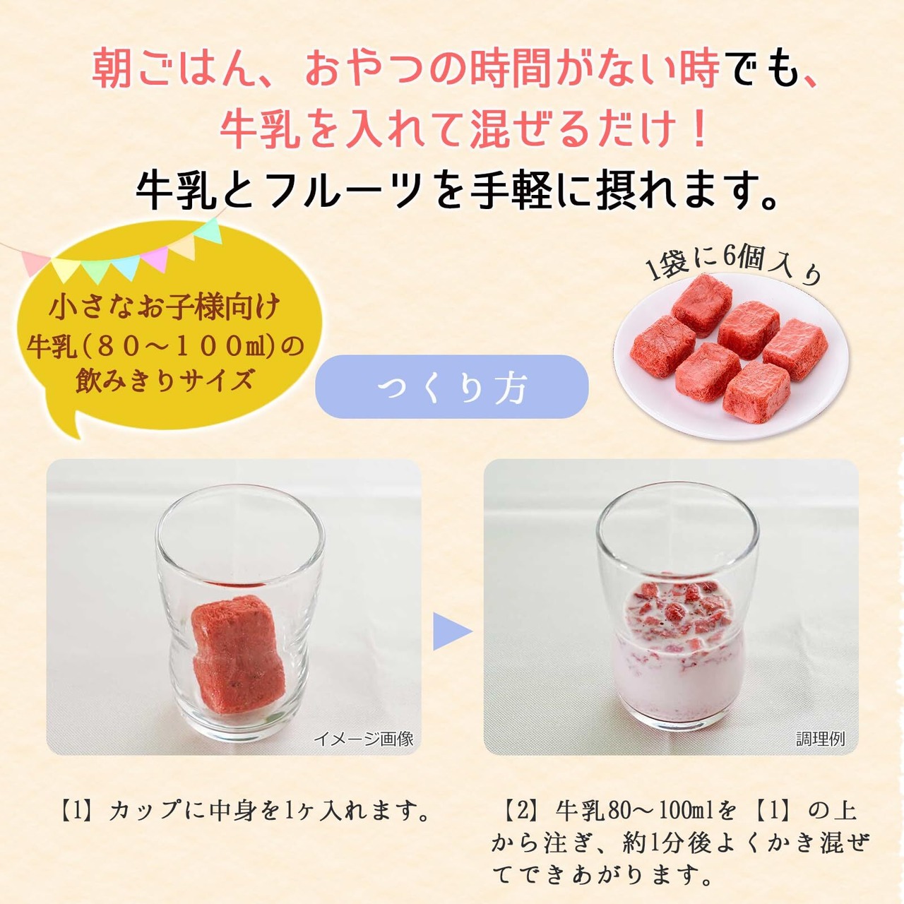 冷たい牛乳(80~100ml)を注いでかき混ぜたら、ザク切りのいちご果肉が入ったいちごミルクができる6食入り。 原材料は[いちご・砂糖・でん粉]の3つだけ。より多くの方に安心して召し上がっていただけます。 「ザク切りいちご」より少し小さめのブロックが、チャック付の袋に6個入っています。 小さなお子様や、おかわりしたい!という成長期の元気なお子様にも嬉しい商品です。