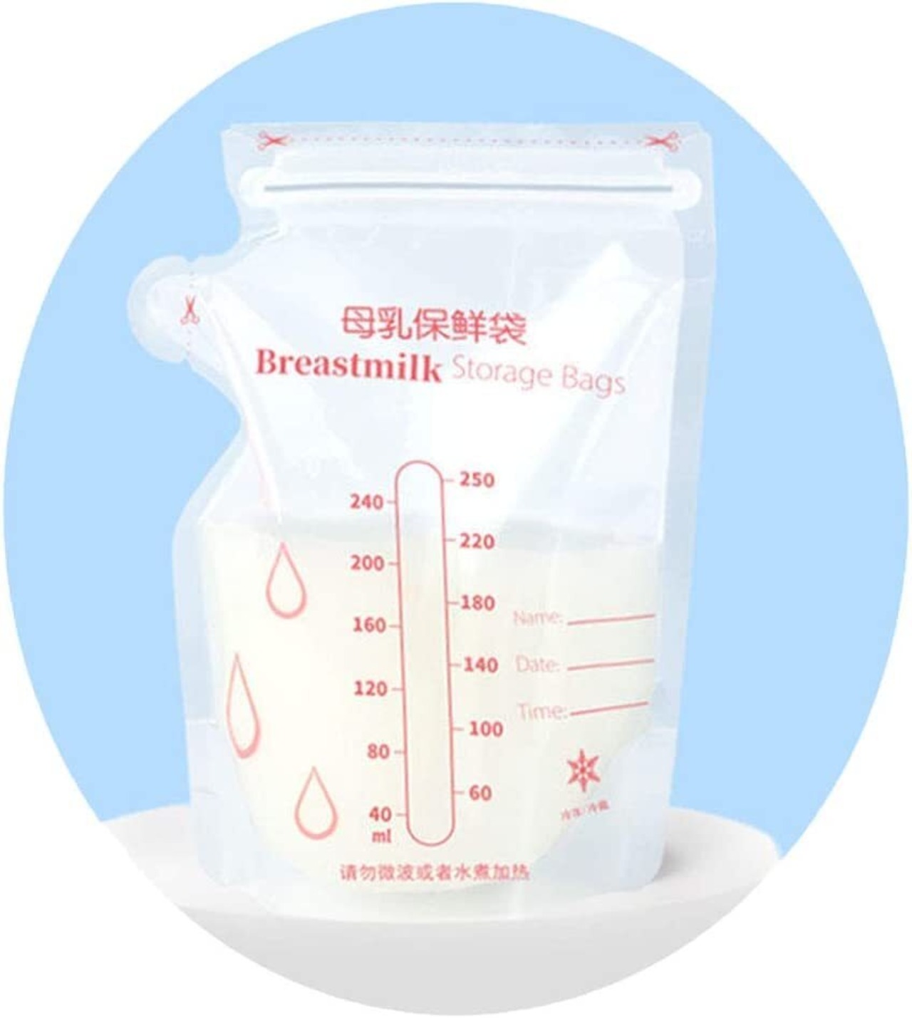 支えやすい自立式母乳バッグ。冷蔵庫や冷凍庫の保管スペースを節約するために平らに置くこともできます。解凍すると、より均一に早く溶けるようになります。