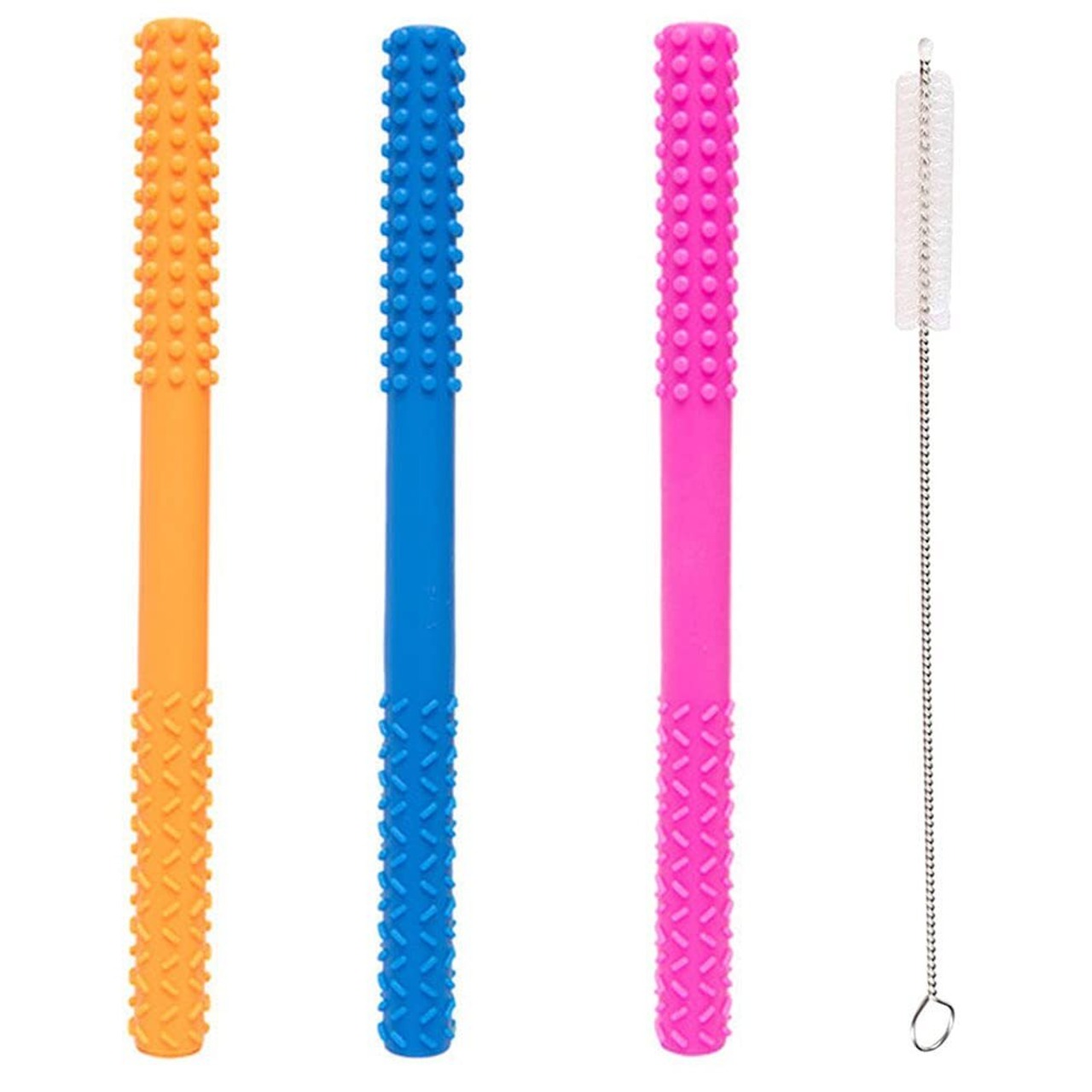 ベビー歯固め ストロー形状 歯痛みを和らげます 食品級シリコン 安全無毒 BPAフリー 3~12ヶ月 新生児 おもちゃ-生産お祝い(3本のストロー+1本のクリーナーブラシ)